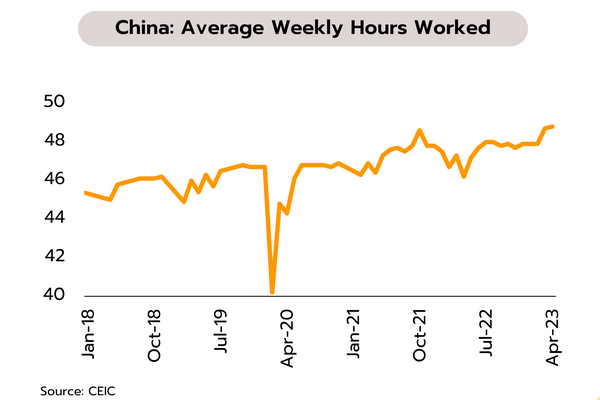 วิจัยกรุงศรีประเมินว่าการฟื้นตัวตามวัฏจักร (Cyclical Recovery) ยังหนุนให้เศรษฐกิจจีนเติบโตสูงราว 5-6% ในปีนี้ สะท้อนจากการขยายตัวอย่างต่อเนื่องของภาคบริการ ผนวกกับการกลับมาขยายตัวของภาคอุตสาหกรรมรายกลางและรายเล็ก นอกจากนี้ ค่าเฉลี่ยของชั่วโมงการทำงานรายสัปดาห์เพิ่มขึ้นสู่ระดับสูงสุดเป็นประวัติการณ์ในเดือนเมษายน และอัตราการว่างงานในเขตเมืองลดลงสู่ระดับต่ำสุดในรอบ 16 เดือนที่ 5.2% ในเดือนเมษายน ซึ่งดีกว่าเป้าหมายของทางการที่ 5.5% ทั้งนี้ แม้การฟื้นตัวตามวัฏจักรจะหนุนการเติบโตของเศรษฐกิจจีนในปีนี้ แต่แรงส่งอาจถูกจำกัดจากการชะลอตัวของเศรษฐกิจโลก และปัจจัยเชิงโครงสร้างของจีน เช่น ความอ่อนแอในภาคอสังหาริมทรัพย์ และปัญหาโครงสร้างประชากร เป็นต้น