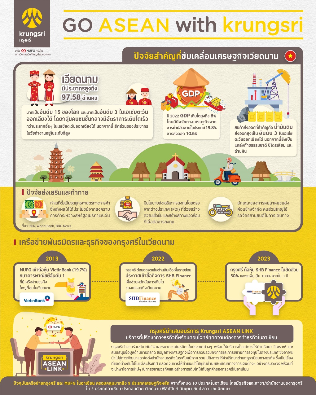“นอกจาก SHB Finance จะเป็นฟันเฟืองสำคัญในการขยายฐานลูกค้ารายย่อยในต่างประเทศแล้วนั้น กรุงศรี ซึ่งเป็นสถาบันการเงินในกลุ่ม MUFG ยังมีความได้เปรียบในเรื่องเครือข่ายที่แข็งแกร่ง โดยสามารถใช้ความรู้ ความเชี่ยวชาญระดับโลก และโอกาสจากเครือข่ายธนาคารพันธมิตรอย่าง VietinBank ธนาคารพาณิชย์ชั้นนำในเวียดนามซึ่ง MUFG เป็นผู้ถือหุ้น ในการผสานความช่วยเหลือและเพิ่มโอกาสให้กับลูกค้าไทยที่ต้องขยายธุรกิจไปในเวียดนาม ซึ่งจากโจทย์ความต้องการของลูกค้าที่ต้องการเป็นที่ปรึกษาหรือพันธมิตรในการให้ความช่วยเหลือหรือสนับสนุนในด้านต่างๆ