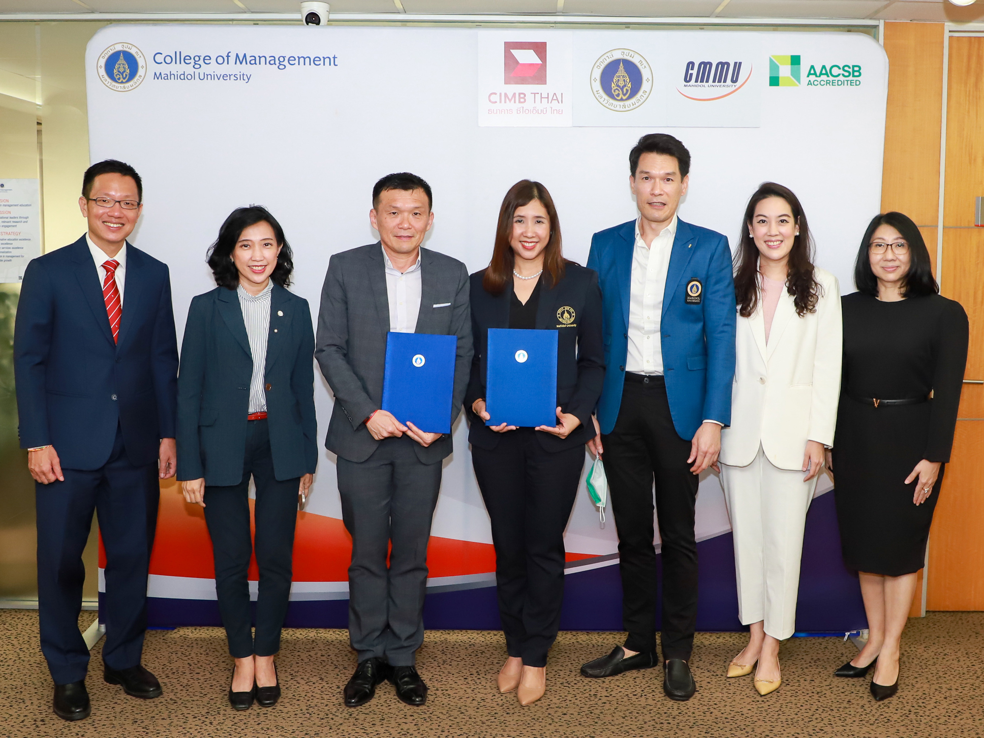 22 มิถุนายน 2566 : พอล วอง ชี คิน กรรมการผู้จัดการใหญ่และประธานเจ้าหน้าที่บริหาร (ที่3 จากซ้าย) กนกไพ วงศ์สถิตย์พร รองกรรมการผู้จัดการใหญ่ ทรัพยากรบุคคล นายลิม ยอง เทียน รองกรรมการผู้จัดการใหญ่ กลยุทธ์และสำนักประธานเจ้าหน้าที่บริหาร ธนาคาร ซีไอเอ็มบี ไทย จำกัด (มหาชน) ร่วมลงนามบันทึกความเข้าใจ (MOU) กับ วิทยาลัยการจัดการ มหาวิทยาลัยมหิดล นำโดย รศ.ดร. วิชิตา รักธรรม คณบดี (ที่4 จากซ้าย) รศ.ดร. สุขสรรค์ กันตะบุตร รองคณบดีงานวิจัย รศ.ดร. ปรารถนา ปุณณกิติเกษม รองคณบดีงานวิชาการ และผศ.ดร. พัลลภา ปีติสันต์ รองคณบดีงานบริการวิชาการ เพื่อร่วมมือด้านวิชาการ ในการแลกเปลี่ยนความรู้และพัฒนาศักยภาพ ทั้งบุคลากรของธนาคารและนักศึกษาของวิทยาลัย