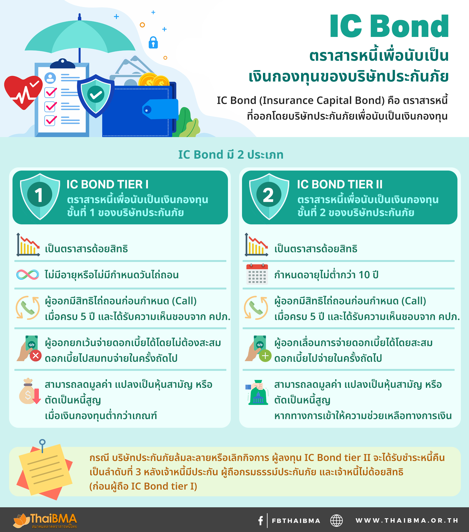 และเพื่อให้เข้าใจถึงตราสารหนี้ IC Bond ได้มากขึ้นทาง สมาคมตราสารหนี้ไทย (ThaiBMA) อธิบายถึงตราสารดังกล่าวว่า IC Bond มี 2 ประเภท ตามชั้นของเงิน กองทุน คือ IC Bond tier I หรือตราสารหนี้ เพื่อนับเป็นเงินกองทุนของบริษัทประกันภัยชั้น ที่ 1 และ IC Bond tier II หรือตราสารหนี้เพื่อ นับเป็นเงินกองทุนของบริษัทประกันภัยชั้นที่ 2 (IC Bond tier II) ซึ่งคล้ายกับหุ้นกู้ Basel III ที่ แบ่งเป็นประเภท AT1 และ Tier 2