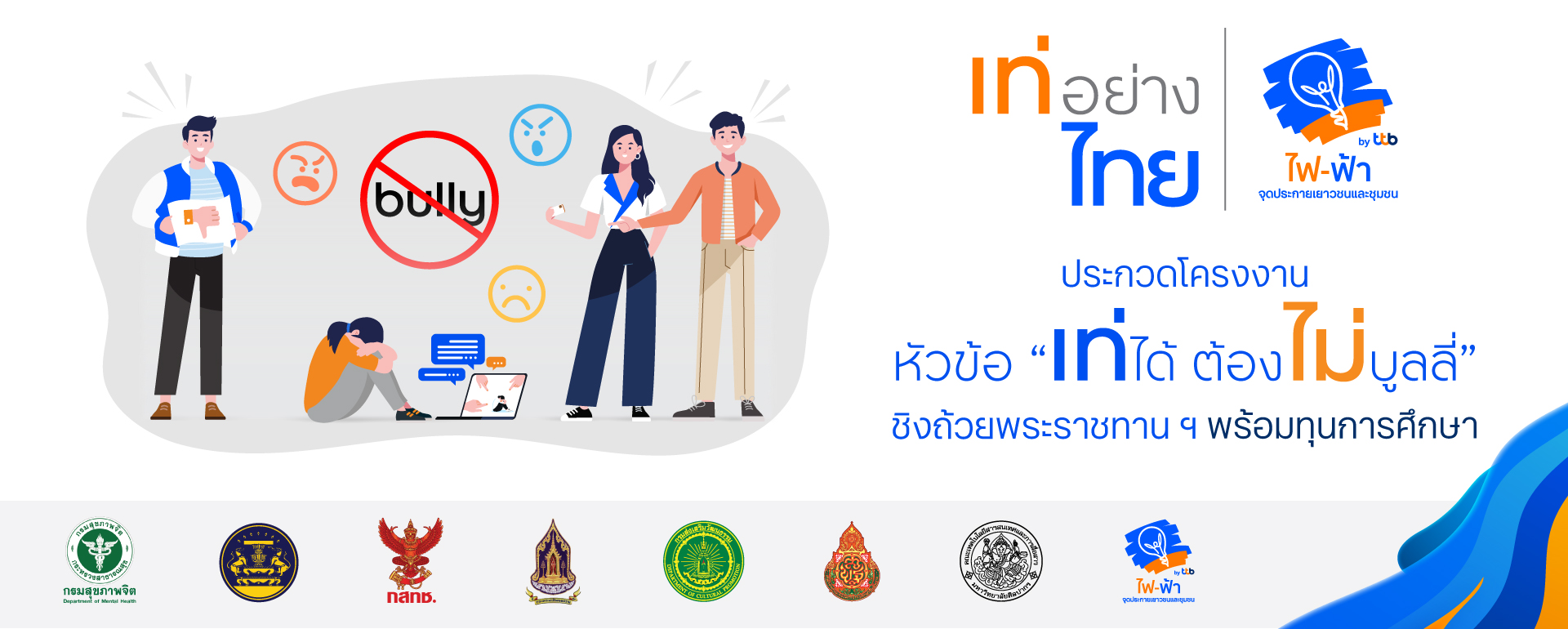 26 มิถุนายน 2566 : โครงการไฟ-ฟ้า โดย ทีทีบี กิจกรรมสังคมเพื่อความยั่งยืน เดินหน้าส่งเสริมทักษะให้กับเยาวชนไทยในทุกมิติ ให้กล้าแสดงออกอย่างเหมาะสม รวมถึงเข้าใจและยอมรับความแตกต่างของผู้อื่น จัดโครงการ “เท่อย่างไทย โดย ไฟ-ฟ้า ทีทีบี” โดยในปีนี้ ได้จัดการประกวดโครงงาน ในหัวข้อ “เท่ได้…ต้องไม่บูลลี่” เพื่อเปิดเวทีสร้างโอกาสให้เยาวชนได้ร่วมกันทำงานเป็นทีมสร้างสรรค์โครงงานเพื่อร่วมรณรงค์ต่อต้านการบูลลี่ โดยกระตุ้นจิตสำนึก และแก้ไขปัญหาที่เกิดขึ้น