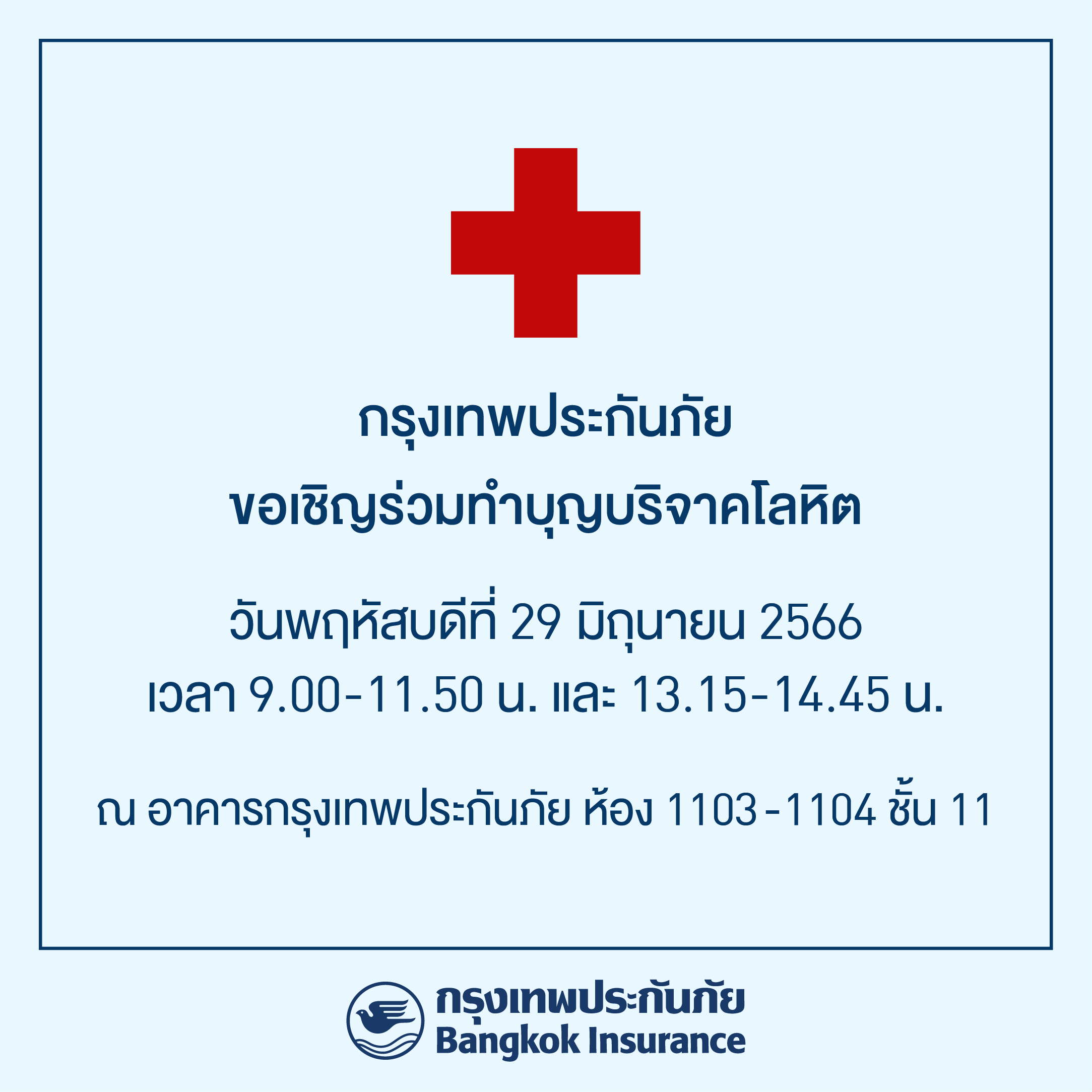 27 มิถุนายน 2566 : บริษัท กรุงเทพประกันภัย จำกัด (มหาชน) จัดกิจกรรมบริจาคโลหิตให้แก่สภากาชาดไทย เพื่อให้มีโลหิตสำรองอย่างเพียงพอต่อการรักษาผู้ป่วย จึงขอเชิญชวนผู้ที่มีสุขภาพร่างกายแข็งแรง ร่วมบริจาคโลหิต ในวันพฤหัสบดีที่ 29 มิถุนายน 2566 ตั้งแต่เวลา 09.00-14.45 น. ณ ห้องประชุม 1103-1104 ชั้น 11 อาคารกรุงเทพประกันภัย สำนักงานใหญ่ ถนนสาทรใต้ วันที่ 29 มิถุนายน 2566 นี้ เตรียมร่างกายให้พร้อมและมาร่วมเป็นผู้ให้ที่ยิ่งใหญ่ด้วยการบริจาคโลหิต เพื่อช่วยชีวิตเพื่อนมนุษย์ด้วยกันและเพื่อเป็นการขอบคุณสำหรับผู้ที่มาร่วมบริจาคโลหิต บริษัทฯได้จัดเตรียมของที่ระลึกมอบให้อีกด้วย
