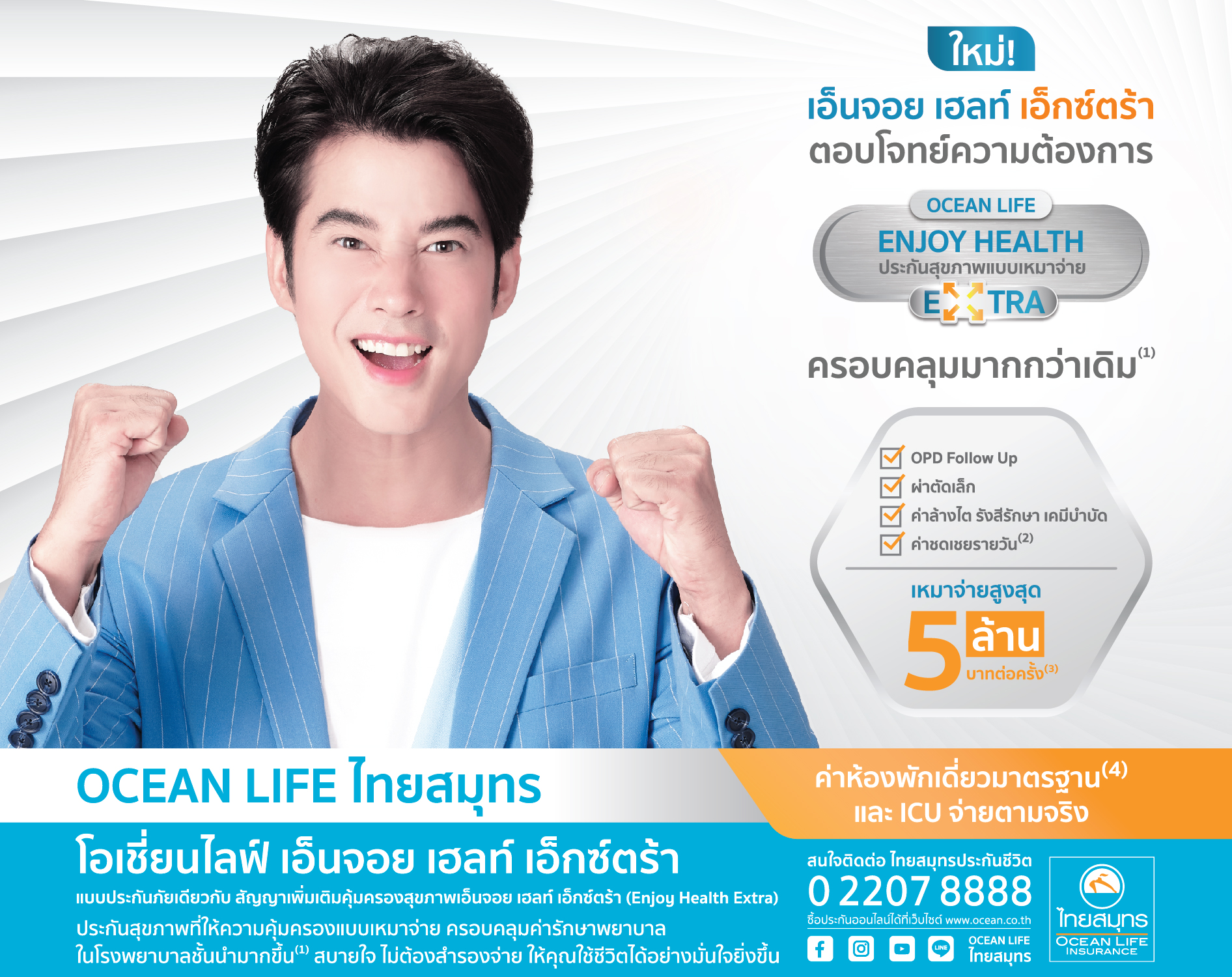 ดังนั้น เพื่อลดความเสี่ยงเลี่ยงค่าใช้จ่ายที่ไม่คาดฝัน OCEAN LIFE ไทยสมุทร ได้พัฒนาผลิตภัณฑ์ประกันสุขภาพที่มีความหลากหลาย ครอบคลุมในทุกกลุ่มทุกไลฟ์สไตล์ และตอบโจทย์ความต้องการ ด้วยประกันสุขภาพแบบเหมาจ่าย “โอเชี่ยนไลฟ์ เอ็นจอย เฮลท์ เอ็กซ์ตร้า - Enjoy Health Extra” ที่ให้ความคุ้มครองแบบครอบคลุมมากกว่าเดิม** นอกเหนือจากความคุ้มครองค่ารักษาพยาบาลผู้ป่วยในแบบเหมาจ่าย ครอบคลุมค่าห้องพักเดี่ยวมาตรฐานในโรงพยาบาลชั้นนำ ด้วยวงเงินความคุ้มครองสูงสุด 5 ล้านบาทต่อครั้งแล้ว