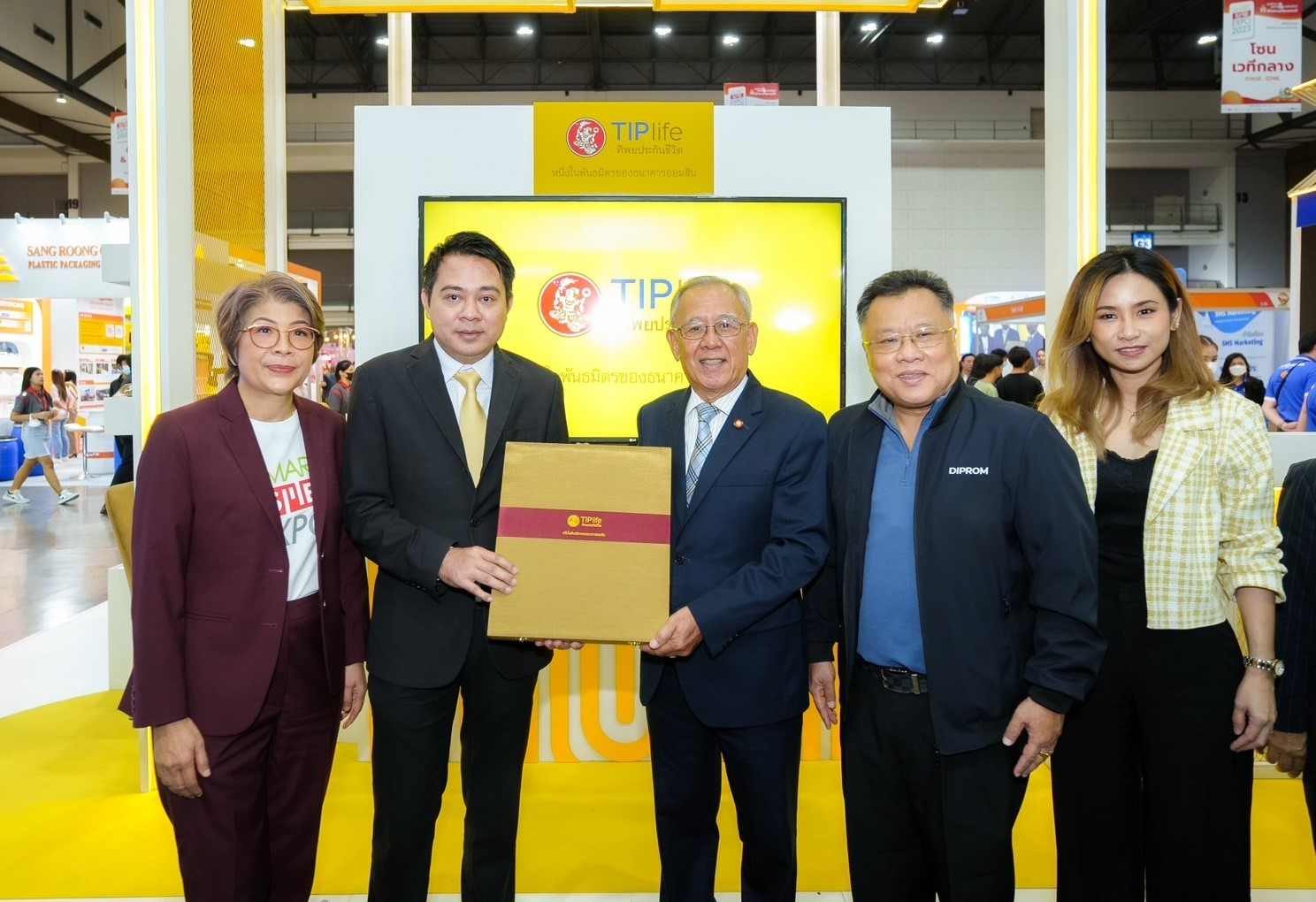 12 กรกฎาคม 2566 : บริษัท ทิพยประกันชีวิต จำกัด (มหาชน) โดย ปราโมทย์ พรมวิเศษ ผู้ช่วยประธานเจ้าหน้าที่บริหารสายงานคณิตศาสตร์ประกันภัย (ลำดับ 2 จากซ้าย) ร่วมพิธีเปิด งาน Smart SME Expo 2023 จัดภายใต้คอนเซ็ปต์ 9 Mega Trend รวม 9 เทรนด์ธุรกิจสุดฮิต แบ่งเป็น 7 โซนธุรกิจ เพื่อผนึกกำลังภาครัฐ และหน่วยงานเอกชน ช่วยส่งเสริมและนำพาธุรกิจ SMEs ให้มีช่องทางการตลาดใหม่ๆ โดยมี ธีระยุทธ วานิชชัง ผู้ช่วยรัฐมนตรีประจำกระทรวงอุตสาหกรรม (ลำดับกลาง) ประธานพิธีเปิดงาน และ ณรินณ์ทิพ วิริยะบัณฑิตกุล (ลำดับ 1 จากซ้าย) ประธานเจ้าหน้าที่บริหาร บริษัท พีเอ็มจี คอร์ปอเรชั่น จำกัด ผู้จัดงาน Smart SME EXPO 2023 ร่วมเยี่ยมชมบูธทิพยประกันชีวิต