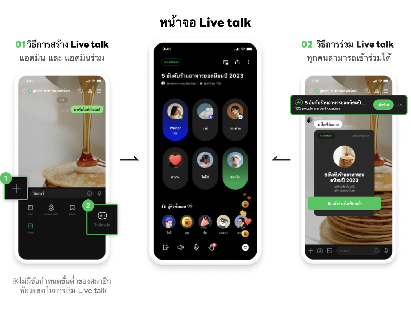 · สมาชิกโอเพนแชทสามารถเลือกกดเข้าร่วมฟังหรือพูดคุยได้ตามความสมัครใจ หากไม่ได้กดเข้าร่วมฟัง Live talk ก็ยังสามารถแชทในห้องนั้นๆ ได้ตามปกติ