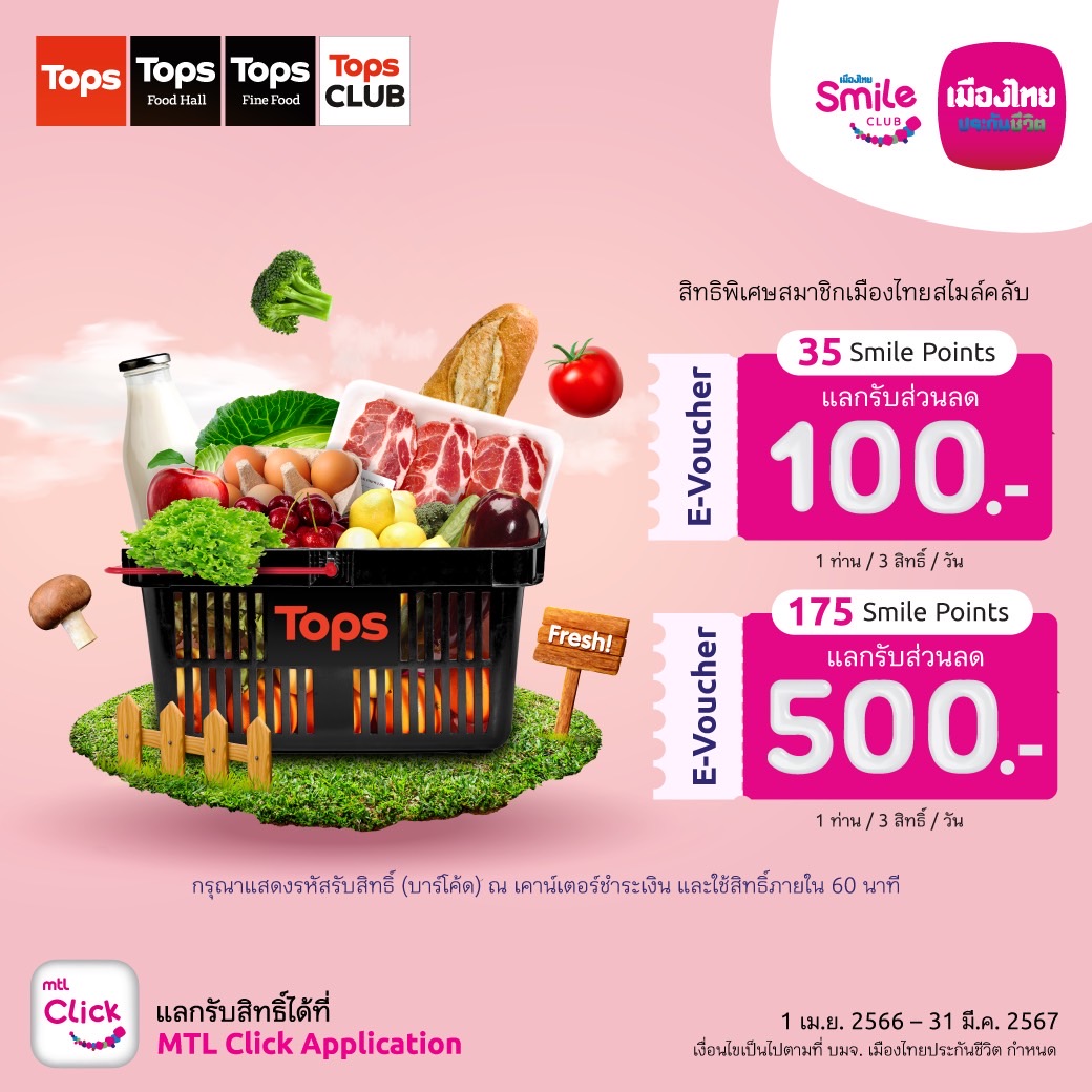 · ช้อปแบบชิลๆ เน้นคุ้มค่าราคาประหยัด สิทธิพิเศษสำหรับสมาชิกฯ สามารถแลกคะแนนสะสมเพื่อรับส่วนลดแทนเงินสดสำหรับซื้อสินค้าในราคาประหยัดได้ เพียงใช้ 35 Smile Points แลกรับ E-Voucher 100 บาท หรือใช้ 175 Smile Points แลกรับ E-Voucher 500 บาท โดยสมาชิกฯ สามารถแลกคะแนนสะสม Smile Point ได้ทาง MTL Click Application และนำรหัสรับสิทธิ์ (บาร์โค้ด) ที่ได้รับมาแสดง ณ เคาน์เตอร์ชำระเงิน ภายในระยะเวลาที่กำหนดเพื่อใช้สิทธิ์ได้ที่ Tops, Tops Food Hall, Tops Fine Food และ Tops CLUB ทุกสาขา (ยกเว้น Tops Online ไม่เข้าร่วมรายการ) ระยะเวลาแลกสิทธิ์ วันนี้ - 31 มีนาคม 2567