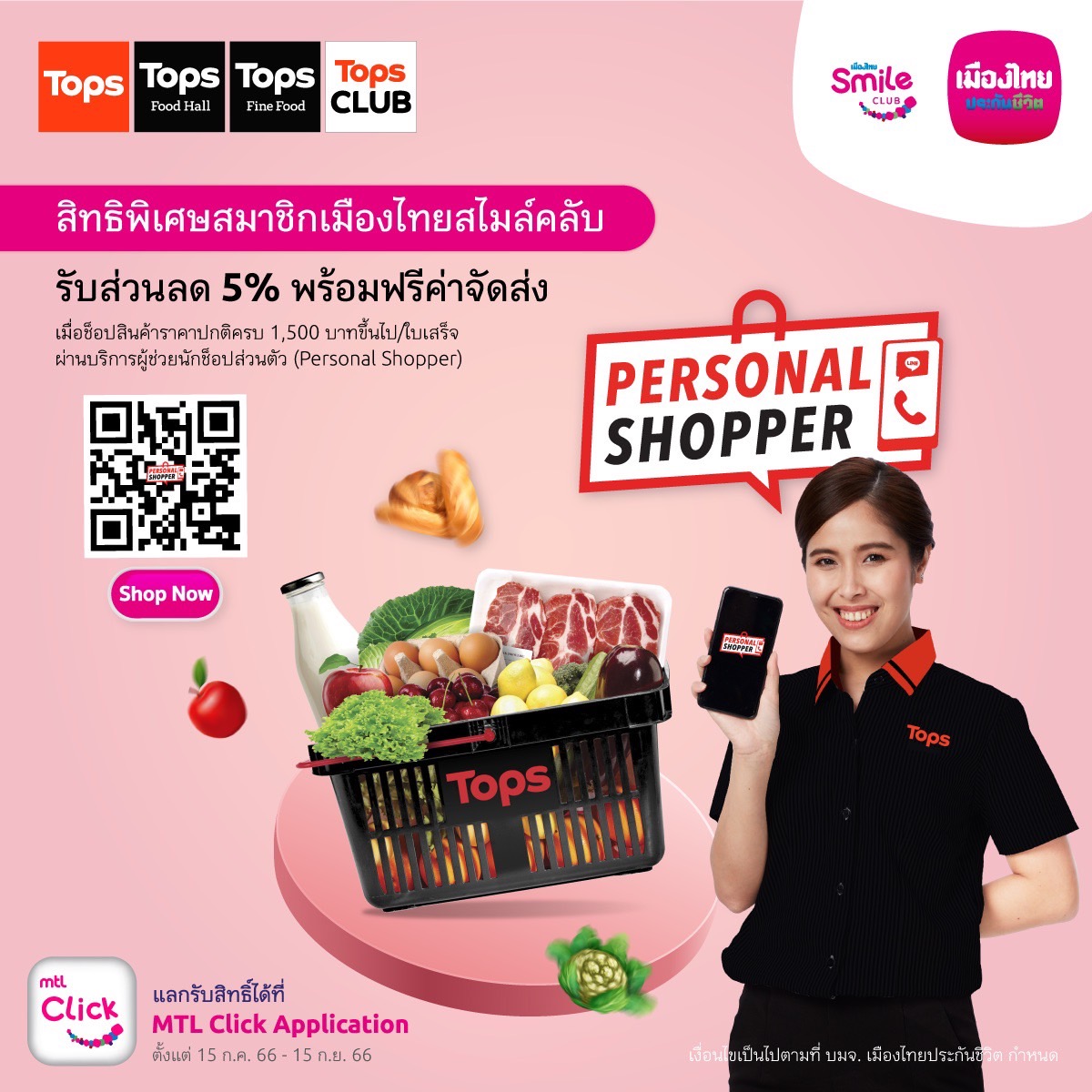 · ช้อปแบบรู้ใจ ช้อปให้เฉพาะคุณ สิทธิพิเศษสำหรับสมาชิกฯ ที่ช้อปสินค้าราคาปกติครบ 1,500 บาทขึ้นไป/ใบเสร็จ ผ่านบริการผู้ช่วยนักช้อปส่วนตัว (Personal Shopper) รับส่วนลด 5% พร้อมฟรีค่าจัดส่ง สามารถรับสิทธิ์ได้ทาง MTL Click Application แบบไม่ต้องใช้คะแนนสะสม Smile Point และใช้สิทธิ์ได้ที่ Line Personal Shopper ของ Tops, Tops Food Hall และ Tops Fine Food สาขาที่ให้บริการ ระยะเวลารับสิทธิ์ วันนี้ – 15 กันยายน 2566 จำกัดจำนวน 500 สิทธิ์ ตลอดโครงการเท่านั้น