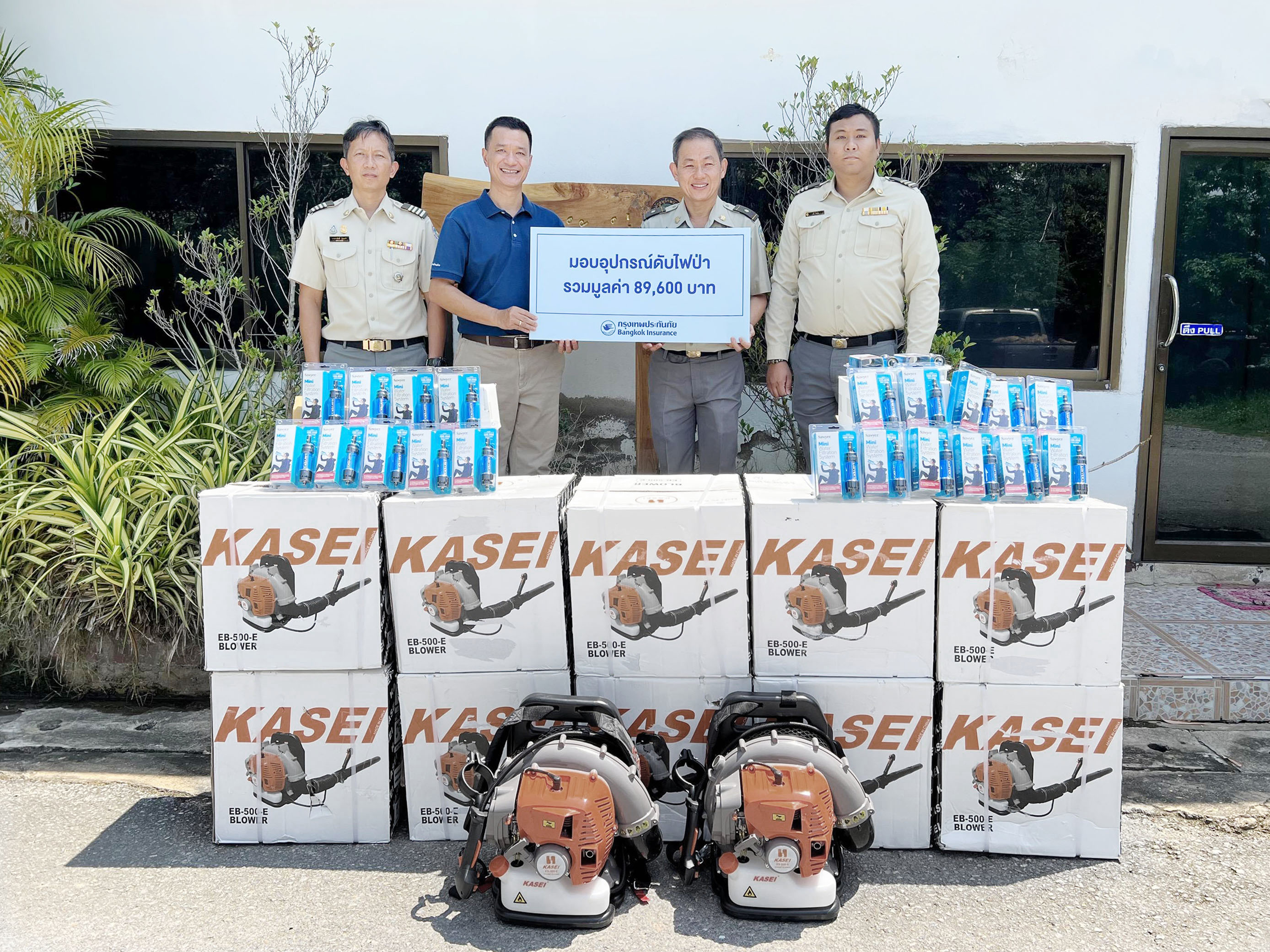 26 กรกฎาคม 2566 : บริษัท กรุงเทพประกันภัย จำกัด (มหาชน) โดย นิยม มูลศรี (ที่ 2 จากซ้าย) ผู้จัดการสาขาอุตรดิตถ์ เป็นผู้แทนบริษัทฯ มอบเครื่องเป่าลม จำนวน 10 เครื่อง และเครื่องกรองน้ำพกพา จำนวน 30 ชุด มูลค่ารวม 89,600 บาท ให้แก่ บทมากร ศรีสุวรรณ (ที่ 2 จากขวา) ผู้อำนวยการสำนักบริหารพื้นที่อนุรักษ์ที่ 13 (แพร่) เพื่อเพิ่มประสิทธิภาพในการทำภารกิจป้องกันรักษาป่าและการดับไฟป่า ในพื้นที่ภาคเหนือ ช่วยลดมลพิษจากการเกิดหมอกควันและฝุ่นพิษในอากาศ ตลอดจนช่วยบรรเทาผลกระทบต่อสุขภาพของประชาชน ณ บริษัท กรุงเทพประกันภัย จำกัด (มหาชน)