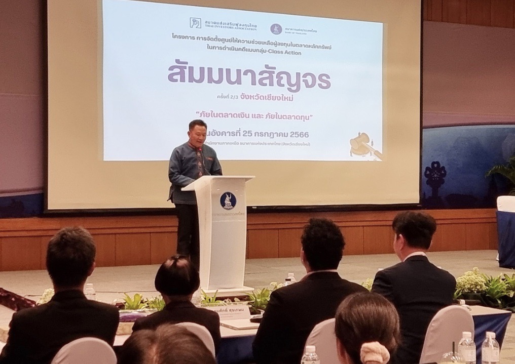 26 กรกฎาคม 2566 : สมาคมส่งเสริมผู้ลงทุนไทยร่วมมือธนาคารแห่งประเทศไทย(ธปท.) สัมมนาสัญจร ให้ความรู้การดำเนินคดีแบบกลุ่ม “Class Action” ครั้งที่ 2 ที่จังหวัดเชียงใหม่ กลุ่มผู้นำทางสังคม-ทนายความ –บจ. และโบรกเกอร์ กว่า 100 คนเข้าร่วมฟัง หวังเป็นกลไกหนึ่งในการดูแลและรับมือ “ภัยในตลาดเงิน และ ภัยในตลาดทุน” ด้าน ธปท.เปิดตัวเลข ร้องผ่าน 1213 ครึ่งปี 5 พันเรื่อง หลอกให้กู้ -โอนเงินผ่านแอบพลิเคชั่น