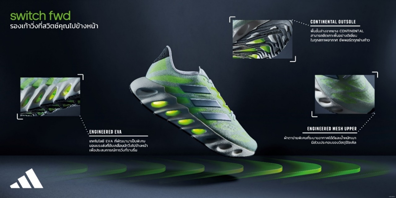 27 กรกฎาคม 2566 : อาดิดาส เปิดตัว SWITCH FWD รองเท้าวิ่งใหม่ล่าสุดที่ช่วยส่งแรงไปข้างหน้าในทุกย่างก้าว มาพร้อมเทคโนโลยีขั้นสูงด้วยโครงสร้างพื้นรองเท้าชั้นกลางโฟม EVA และดีไซน์การเจาะรูสุดล้ำบนตัวโฟม ซึ่งช่วยในการยุบและเด้งคืนตัวเพื่อเปลี่ยนการลงน้ำหนักเท้าให้เป็นแรงส่งตัวไปข้างหน้า โดยนวัตกรรมนี้จะช่วยปลดล็อกศักยภาพของนักกีฬาทุกระดับให้เคลื่อนตัวไปข้างหน้าได้อย่างมีประสิทธิภาพ พร้อมสัมผัสประสบการณ์การวิ่งที่ราบรื่นอันเป็นเอกลักษณ์เฉพาะตัวของรองเท้าวิ่งที่เปี่ยมไปด้วยเทคโนโลยีขั้นสูงคู่นี้