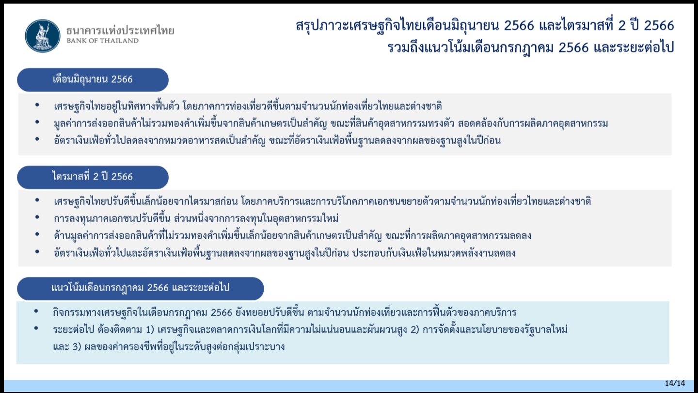 1 สิงหาคม 2566 : คุณชญาวดี ชัยอนันต์ ผู้ช่วยผู้ว่าการ สายองค์กรสัมพันธ์ ธนาคารแห่งประเทศไทย เผยถึงเศรษฐกิจไทยในเดือนมิถุนายน 2566 อยู่ในทิศทางฟื้นตัว โดยภาคการท่องเที่ยวปรับดีขึ้นตามจำนวนนักท่องเที่ยวไทยและต่างชาติ รวมทั้งมูลค่าการส่งออกสินค้าที่ไม่รวมทองคำปรับเพิ่มขึ้นจากสินค้าเกษตรเป็นสำคัญ