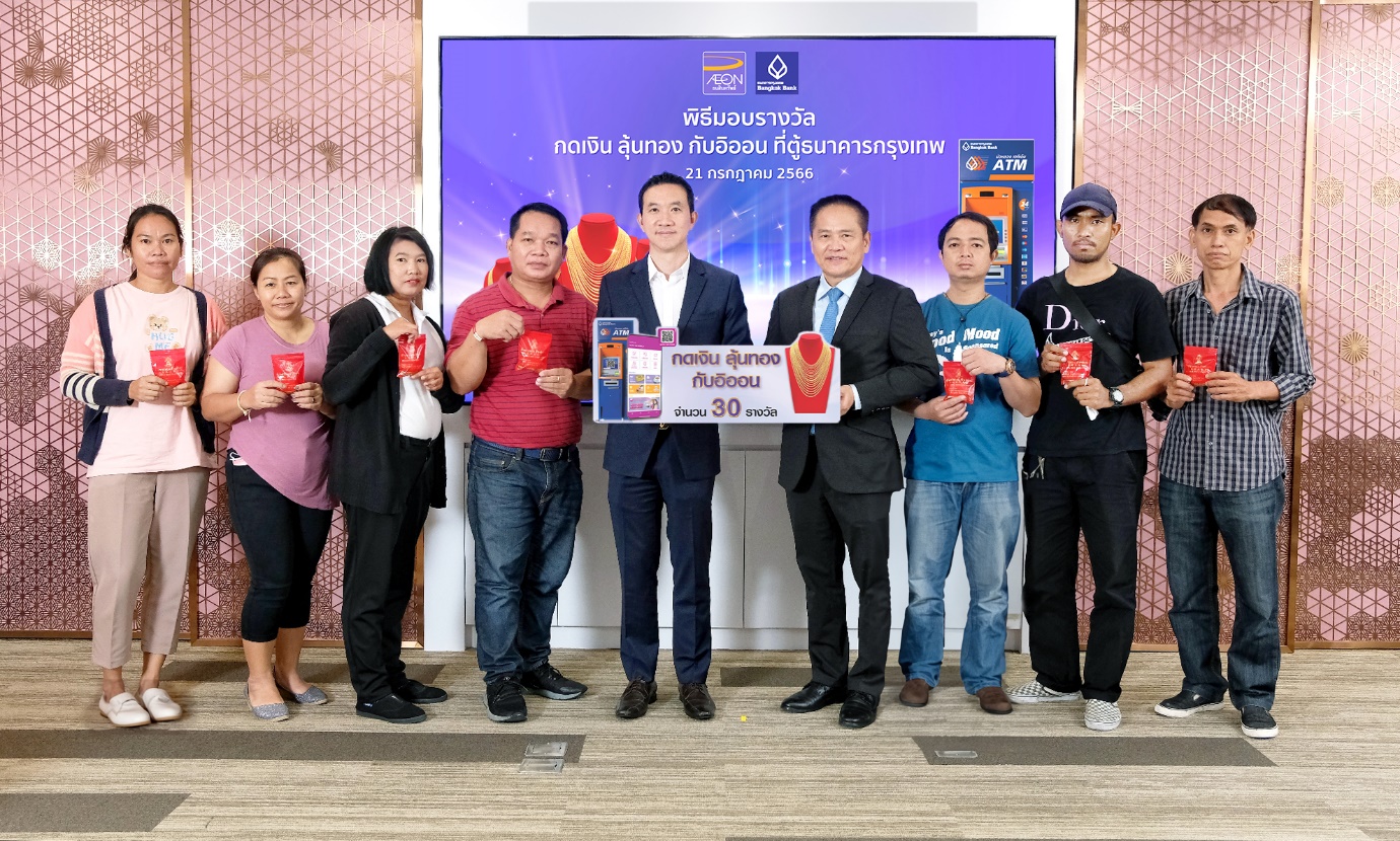 กรุงเทพฯ, 4 สิงหาคม 2566 : คุณวิรัช สิทธิวราภรณ์ (ที่ 5 จากซ้าย) รองกรรมการผู้จัดการอาวุโสฝ่ายการตลาด บริษัท อิออน ธนสินทรัพย์ (ไทยแลนด์) จำกัด (มหาชน) พร้อมด้วย คุณสมบัติ ลิ่มสุวัฒนาพงษ์ (ที่ 4 จากขวา) ผู้จัดการภาคนครหลวง 4 ธนาคารกรุงเทพ จำกัด (มหาชน) ร่วมแสดงความยินดีกับผู้โชคดีที่ได้รับรางวัลจากแคมเปญ “กดเงิน ลุ้นทอง กับอิออน” ที่อิออนร่วมกับธนาคารกรุงเทพ จัดหนักแจกโชคเป็นรางวัลสร้อยคอทองคำหนักหนึ่งบาท มูลค่ารางวัลละ 29,920 บาท* จำนวน 30 รางวัล มูลค่ารวม 897,600 บาท แก่ลูกค้าที่ใช้บริการเบิกถอนเงินสดจากวงเงินบัตรเครดิตอิออน หรือวงเงินสินเชื่อยัวร์แคช