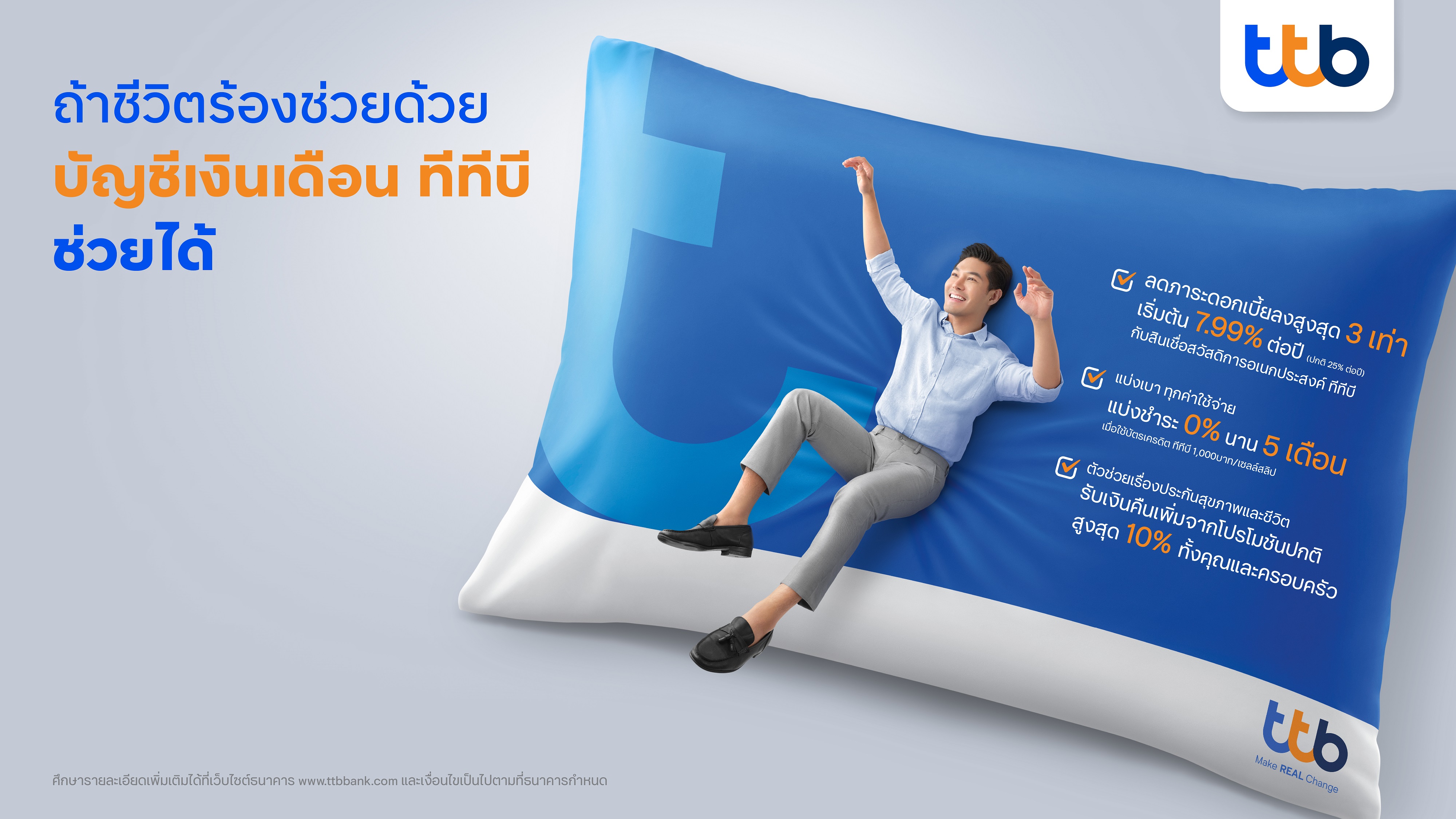 สำหรับ ทีเอ็มบีธนชาต หรือทีทีบี ที่มีเป้าหมายมุ่งสร้างชีวิตทางการเงินที่ดีขึ้นให้กับคนไทยทั้งในวันนี้ และอนาคต จึงได้พัฒนาและยกระดับสวัสดิการให้กับลูกค้ากลุ่มพนักงานเงินเดือนที่รับบัญชีเงินเดือน ทีทีบี ‘ถ้าชีวิตร้องช่วยด้วย บัญชีเงินเดือน ทีทีบี ช่วยได้’ เพราะตอบโจทย์ทุกเป้าหมาย สามารถแบ่งเบาทุกภาระในชีวิต และให้ได้มากกว่าบัญชีเงินเดือนทั่วไป โดยลำพังเพียงเงินเดือนอย่างเดียวอาจจะไม่สามารถช่วยทำให้ชีวิตดีขึ้นได้ แต่บัญชีเงินเดือน ทีทีบี ทำให้ชีวิตดีขึ้นได้เพราะเป็นเหมือนตัวช่วยที่จะมาแก้ปัญหา ภาระ และข้อจำกัดของชีวิตมนุษย์เงินเดือน ไม่ว่าจะเงินเดือนไม่พอกับรายจ่าย หนี้สินรุมเร้า จะกู้เพิ่มก็ถูกปฏิเสธเพราะภาระหนี้ที่สูงกว่ารายรับ เป็นต้น