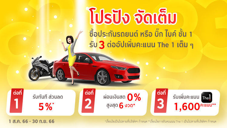 ต่อที่ 1 ลด : รับทันที ส่วนลด 5% จากเบี้ยประกันภัยสุทธิขั้นต่ำตั้งแต่ 10,000 บาทขึ้นไป (ส่วนลดเริ่มต้น 500 บาท) สำหรับลูกค้าที่ซื้อประกันภัยรถยนต์ส่วนบุคคลชั้น 1 หรือ ประกันภัย บิ๊ก ไบค์ ชั้น 1
