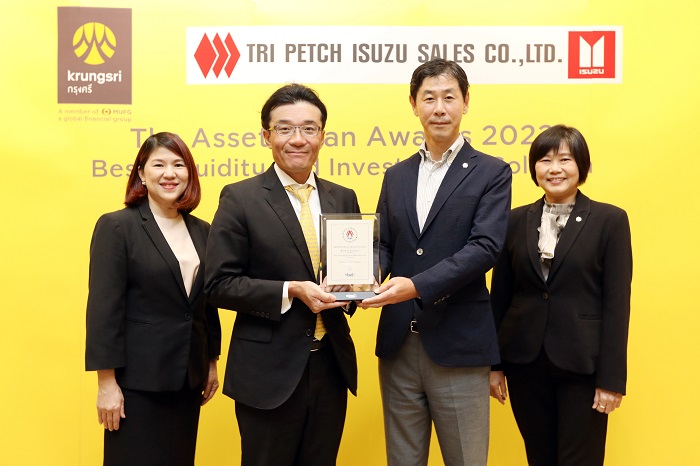 กรุงเทพฯ, 8 สิงหาคม 2566 : บุนเซอิ โอคุโบะ (ที่ 2 จากซ้าย) ประธานกลุ่มธุรกิจธนกิจพาณิชย์เกี่ยวกับญี่ปุ่นและบรรษัทข้ามชาติ (JPC/MNC Banking) ธนาคารกรุงศรีอยุธยา จำกัด (มหาชน) และ นาโอยะ เซะงูจิ (ที่ 2 จากขวา) รองกรรมการผู้จัดการ บริษัท ตรีเพชรอีซูซุเซลส์ จำกัด รับรางวัลยอดเยี่ยม Best Liquidity and Investments Solution จากงาน The Asset Asian Awards 2023