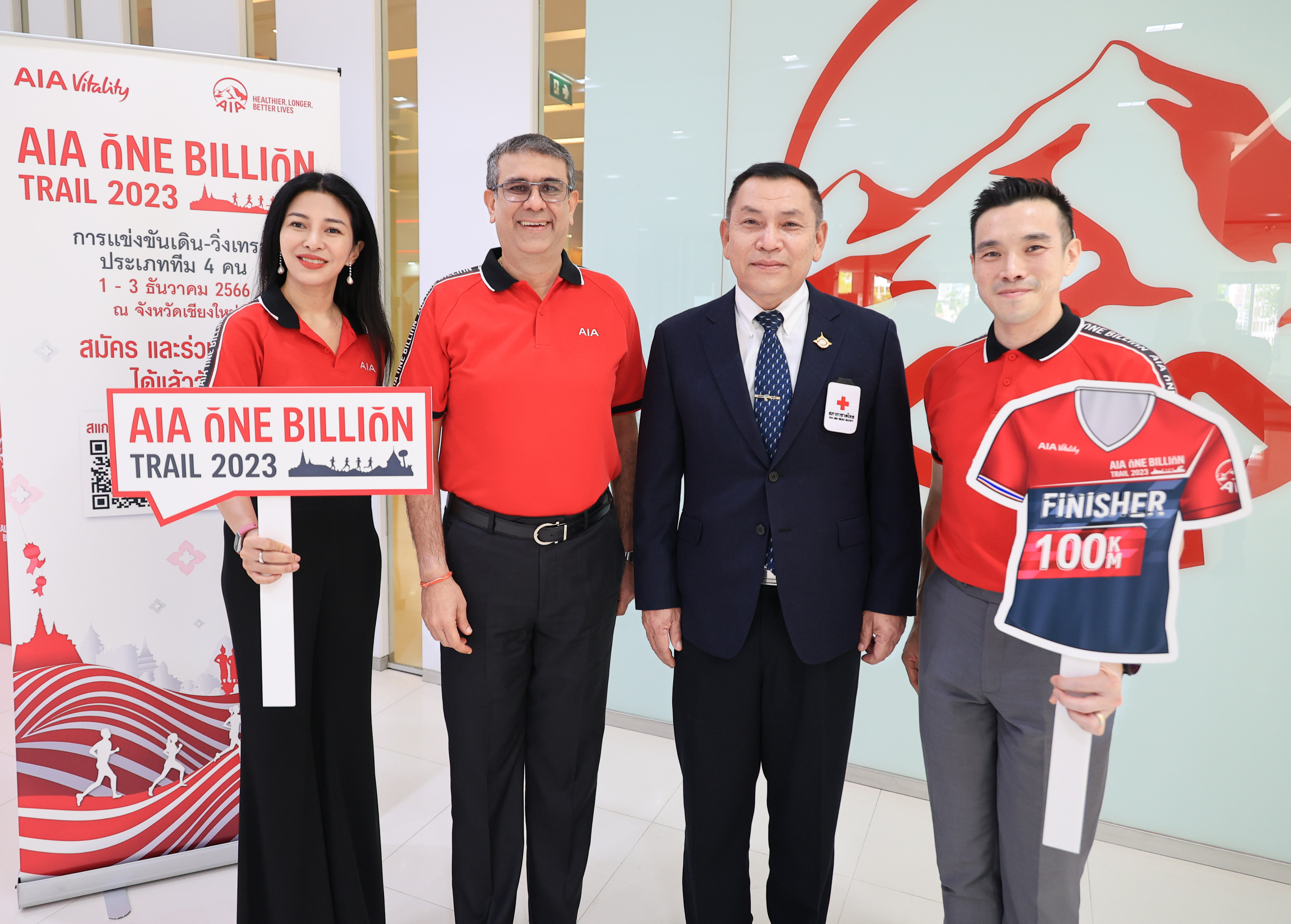กรุงเทพฯ 9 สิงหาคม 2566 : เอไอเอ ประเทศไทย นำโดย นิคฮิล แอดวานี ประธานเจ้าหน้าที่บริหาร, ณัฐพิสิษฐ์ ครุฑครองชัย ประธานเจ้าหน้าที่ฝ่ายตัวแทนประกันชีวิต และ รพีพร วงศ์ทองคำ ผู้อำนวยการฝ่ายสื่อสารองค์กรและภาพลักษณ์ พร้อมด้วย นายวิทยา จันทร์ฉลอง ผู้ช่วยผู้อำนวยการสำนักงาน บริหารกิจการเหล่ากาชาด ร่วมเปิดตัวโครงการ AIA One Billion Trail 2023 การแข่งขันเดิน – วิ่งเทรล ประเภททีม 4 คน ซึ่งจัดขึ้นต่อเนื่องเป็นปีที่ 2