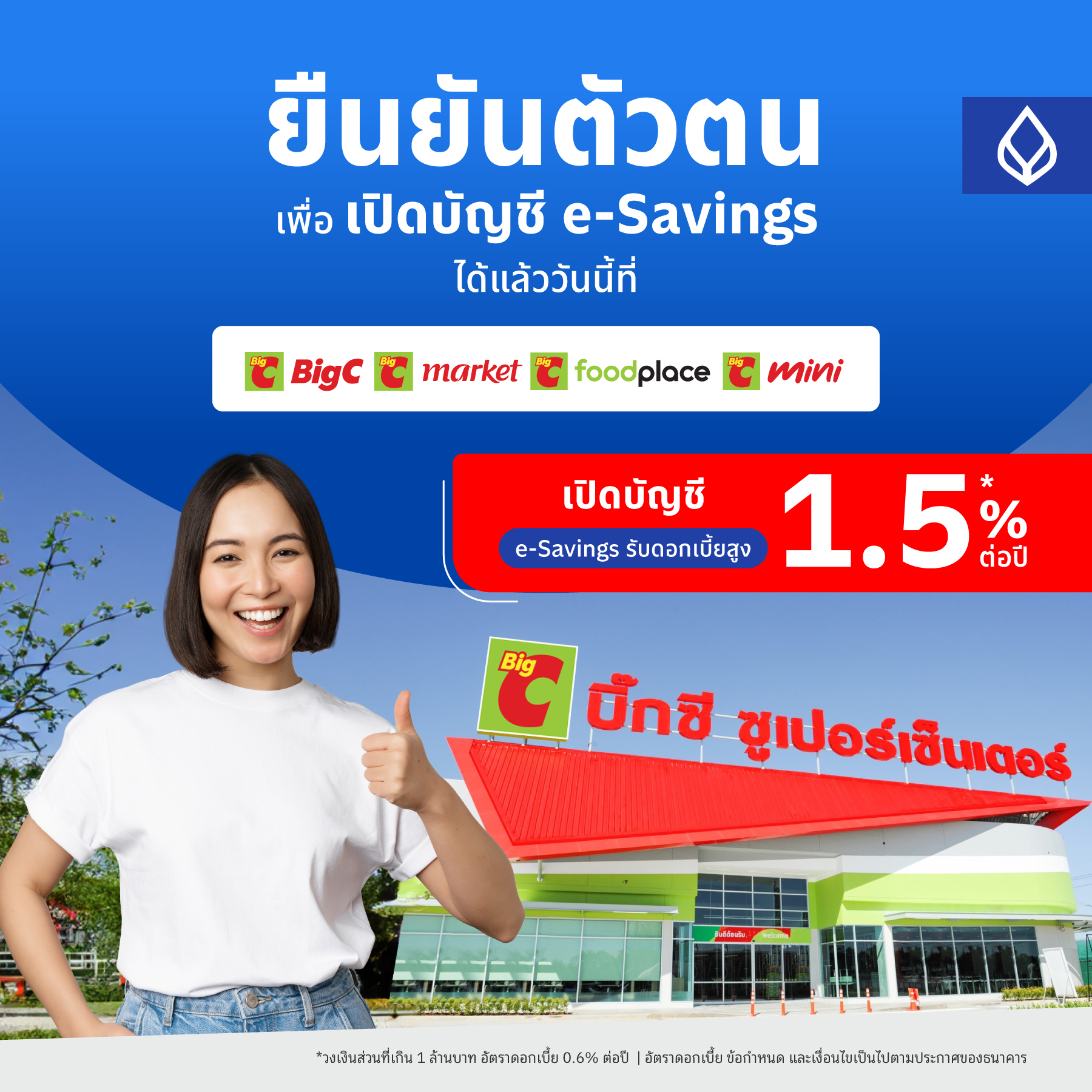 ติดต่อทำรายการยืนยันตัวตน ณ จุดบริการ Big Service หรือเคาน์เตอร์ชำระเงินของบิ๊กซี ไม่ว่าจะเป็น บิ๊กซีซูเปอร์เซ็นเตอร์ บิ๊กซีเอ็กซ์ตร้า บิ๊กซีมาร์เก็ต บิ๊กซีฟู้ดเพลส และบิ๊กซีมินิ (เฉพาะสาขาที่ร่วมรายการ) ทุกวัน เวลาทำการ 9.00-22.00 น. (หรือตามเวลาทำการของสาขา) จากนั้นเข้าแอปพลิเคชันโมบายแบงก์กิ้ง จากธนาคารกรุงเทพ เพื่อทำการเปิดบัญชีต่อให้สำเร็จ เท่านี้ก็เปิดบัญชีสะสมทรัพย์ e-Savings ได้เสร็จเรียบร้อย เริ่มต้นฝากเงินรับดอกเบี้ยสูงกันได้เลย