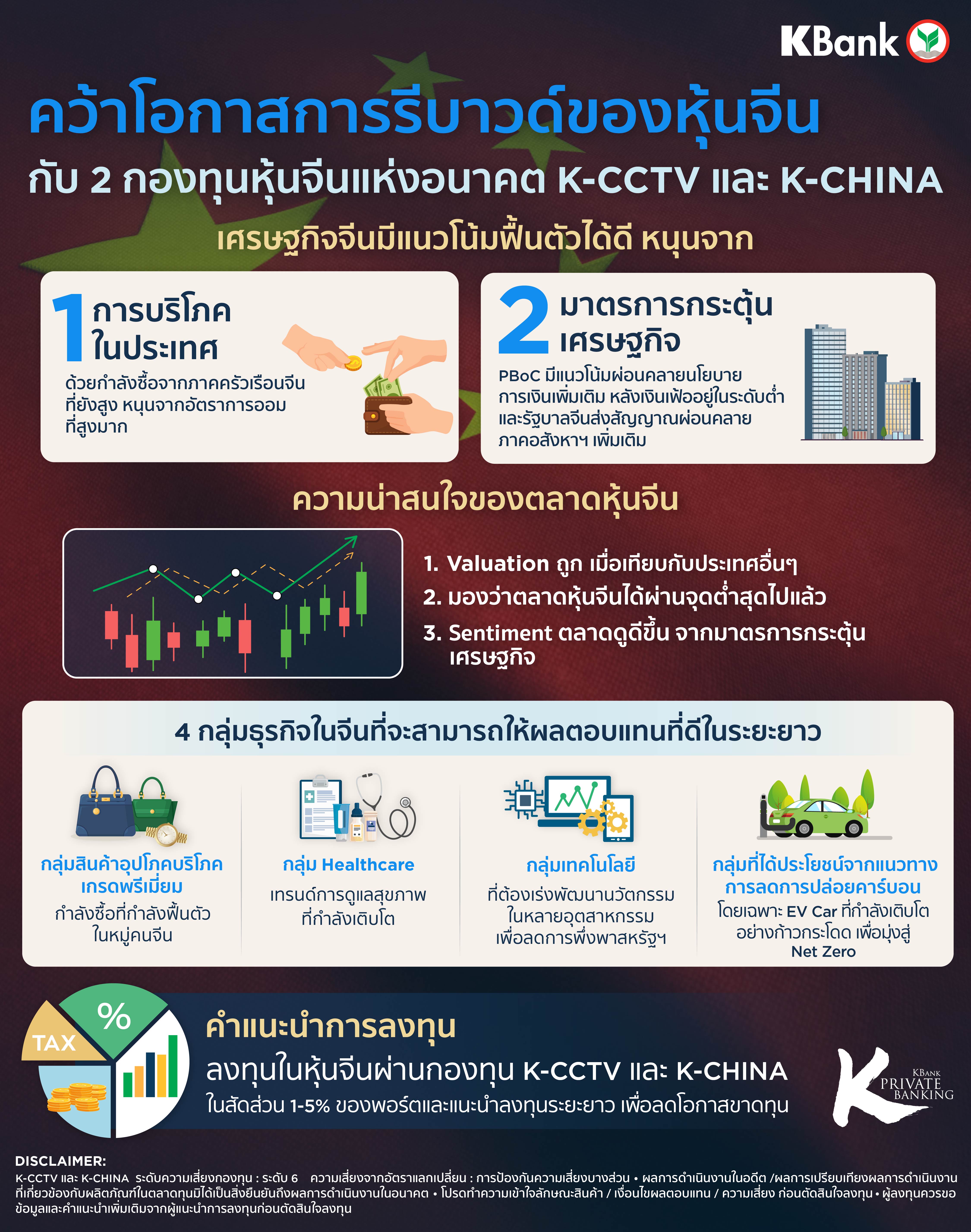 ดังนั้น คำแนะนำสำหรับนักลงทุนที่ต้องการผลตอบแทนจากตลาดหุ้นจีน คือ ลงทุนผ่านกองทุน K-CCTV ที่เน้นลงทุนในหุ้นจีน A-Shares (ตลาดหลักทรัพย์เชี่ยงไฮ้และเชินเจิ้น) พร้อมบริหารความเสี่ยง ด้วยการปรับสัดส่วนอย่างเป็นระบบเพื่อลดความผันผวนแม้ในช่วงที่ตลาดหุ้นจีนมีความผันผวนสูง และ K-CHINA ที่ลงทุนในหุ้นจีนที่จดทะเบียนในจีนแผ่นดินใหญ่ ฮ่องกง และประเทศอื่นๆ (All China)