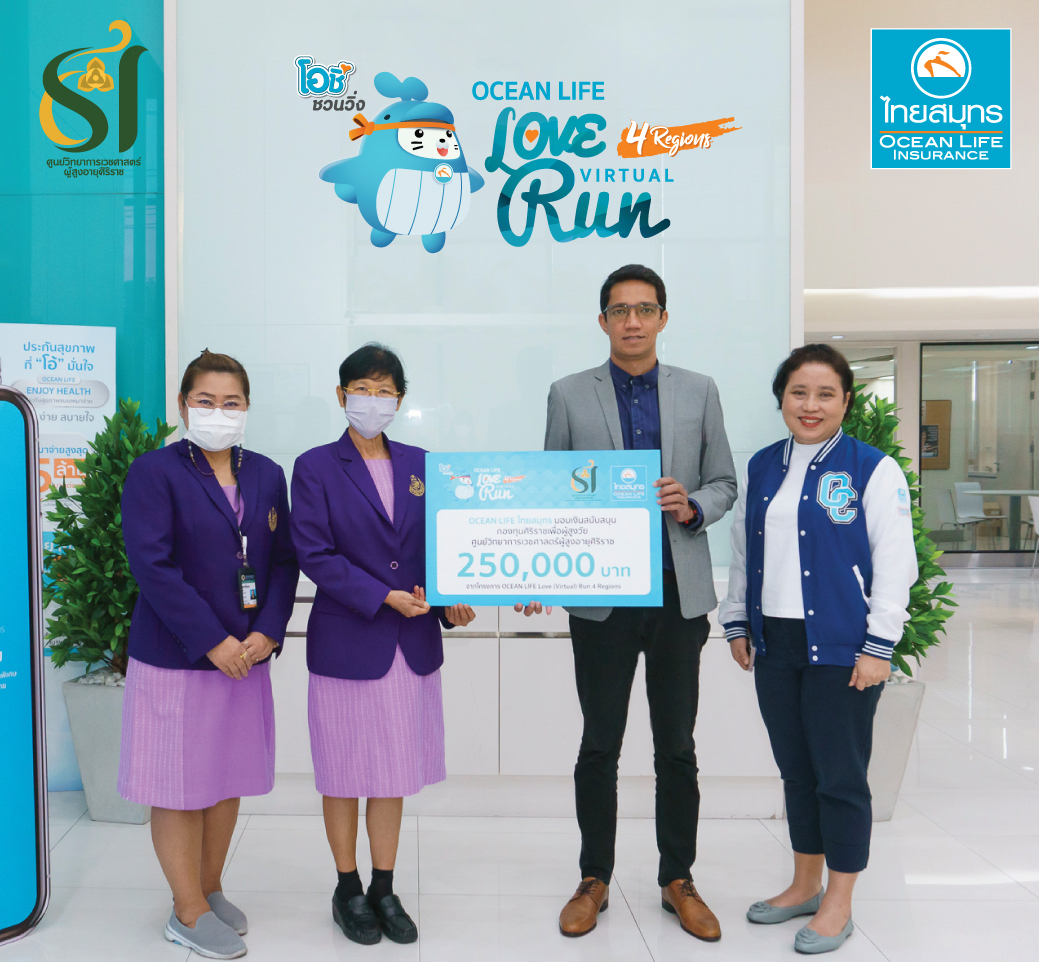 โดยได้ร่วมสนับสนุนเงินจากกิจกรรม OCEAN LIFE LOVE (Virtual) RUN 4 Regions ภาคกลาง จำนวนเงินทั้งสิ้น 250,000 บาท มอบให้แก่ “กองทุนศิริราชเพื่อผู้สูงวัย” เพื่อสร้าง “ศูนย์วิทยาการเวชศาสตร์ผู้สูงอายุศิริราช” ดำเนินงานโดยคณะแพทย์ศาสตร์ศิริราชพยาบาล เพื่อเป็นต้นแบบของประเทศ ในการดูแลผู้ป่วยสูงอายุหลังพ้นการเจ็บป่วยในระยะเฉียบพลัน ให้เตรียมตัวกลับไปใช้ชีวิตต่อที่บ้านได้ และยังเป็นแหล่งเผยแพร่ความรู้ให้กับโรงพยาบาลต่างๆ และสังคมต่อไป