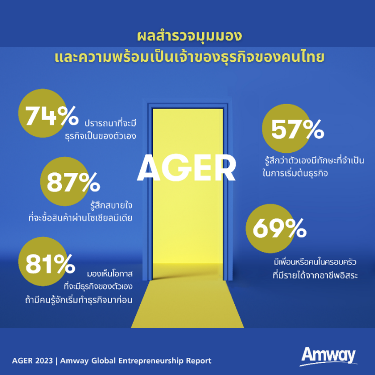 บริษัทขายตรงระดับโลกที่มียอดขายอันดับ 1 ผู้นำด้านสุขภาพและความเป็นอยู่ที่ดีอย่างแอมเวย์ ทำการศึกษาและวิจัย Amway Global Entrepreneurship Report หรือ AGER ประจำปี 2566 ได้เปิดเผยข้อมูลเกี่ยวกับเทรนด์การเริ่มต้นประกอบธุรกิจ โดยจัดทำผลสำรวจจากผู้คนทั่วโลกภายหลังจากการระบาดของเชื้อโควิด-19 โดยรวบรวมข้อมูลจากกลุ่มตัวอย่างมากกว่า 15,000 คน ใน 15 ประเทศ ได้แก่ สหรัฐอเมริกา แคนาดา เยอรมัน ฮ่องกง อินเดีย อิตาลี ญี่ปุ่น จีน มาเลเซีย เม็กซิโก สิงคโปร์ เกาหลีใต้ ไต้หวัน เวียดนาม และไทย พบว่า คนในยุคปัจจุบันมีความพร้อมที่จะเป็นเจ้าของธุรกิจของตัวเองมากกว่าที่ผ่านมา สำหรับผลสำรวจมุมมองและความพร้อมในการประกอบธุรกิจของคนไทยสามารถสรุปได้ 5 ประเด็นสำคัญ ได้แก่
