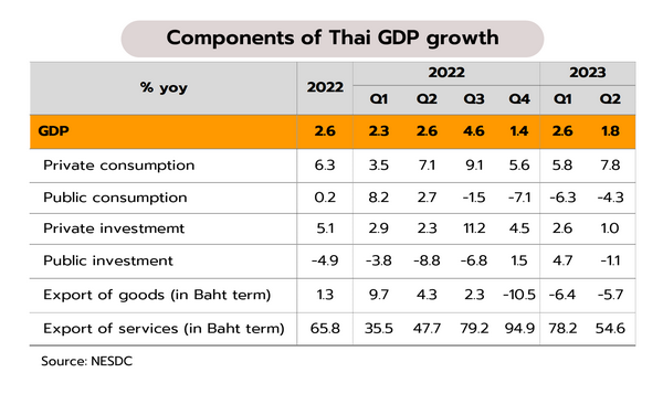 (ii) การใช้จ่ายภาครัฐบาลลดลงต่อเนื่อง ส่วนหนึ่งจากการใช้จ่ายภาครัฐบาลที่เกี่ยวข้องกับการสาธารณสุขมีฐานสูงในปี 2565 และ (iii) การส่งออกสินค้ายังคงหดตัว อย่างไรก็ตาม รายรับจากการส่งออกบริการยังคงขยายตัวสูงจากจำนวนนักท่องเที่ยวต่างชาติที่เพิ่มขึ้น ประกอบกับการใช้จ่ายภาคครัวเรือนที่ยังคงเติบโตสูงต่อเนื่อง นอกจากนี้ ล่าสุดสภาพัฒน์ฯ ปรับลดคาดการณ์ GDP ปีนี้ขยายตัว 2.5-3.0% จากเดิมคาด 2.7-3.7%