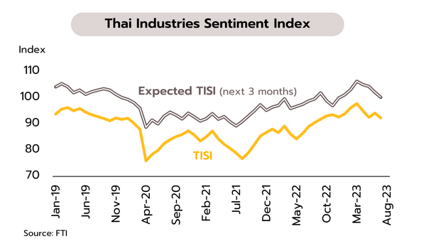 การผลิตภาคอุตสาหกรรมยังมีแนวโน้มอ่อนแอ ผลกระทบจากอุปสงค์ทั้งต่างประเทศและในประเทศที่ชะลอตัวลง ผนวกกับการแข่งขันที่รุนแรงขึ้นจากสินค้าจีน ดัชนีความเชื่อมั่นภาค อุตสาหกรรมในเดือนกรกฏาคมร่วงลงสู่ระดับต่ำสุดในรอบ 10 เดือนที่ 92.3 และลดลงจาก 94.1 ในเดือนมิถุนายน โดยปรับลดลงในทุกองค์ประกอบ ทั้งดัชนีฯ คำสั่งซื้อโดยรวม ยอดขายโดยรวม ปริมาณการผลิต ต้นทุนประกอบการ และผลประกอบการ เช่นเดียวกับดัชนีฯ คาดการณ์ 3 เดือนข้างหน้า ปรับลงมาอยู่ที่ 100.2 จาก 102.1 ในเดือนมิถุนายน