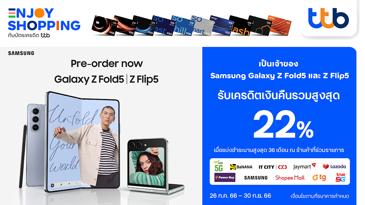 24 สิงหาคม 2566 : ทีเอ็มบีธนชาต หรือ ทีทีบี มอบสิทธิพิเศษสำหรับผู้ถือบัตรเครดิต และบัตรกดเงินสด ttb ด้วยโปรโมชันสุดคุ้มเมื่อซื้อ Samsung Galaxy Z Fold5 | Z Flip 5 และทำรายการแบ่งชำระ 0% นานสูงสุด 36 เดือน ที่ร้านค้าชั้นนำ ได้แก่ AIS, TRUE, BaNANA, Jaymart, TG Fone และ IT City & CSC หรือทางช่องทางออนไลน์ samsung.com , ShopeeMall และ Lazada ระหว่างวันที่ 26 กรกฎาคม 2566 – 30 กันยายน 2566