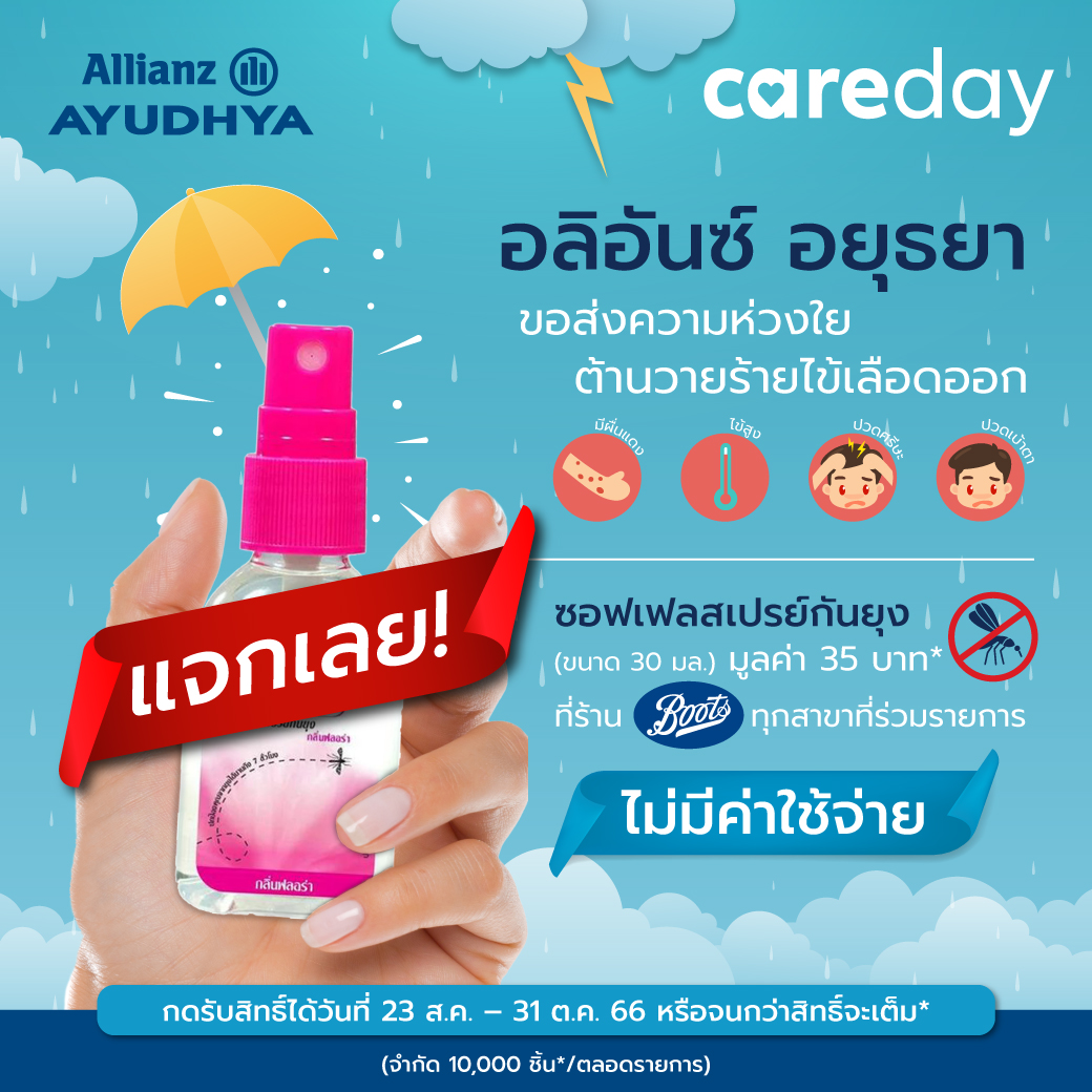 แคมเปญ Care Day 2023 นี้ มอบสิทธิพิเศษให้กับลูกค้าอลิอันซ์ อยุธยา แจกฟรี ซอฟเฟล สเปรย์กันยุง(30ML) 10,000 ชิ้น แทนความห่วงใยมอบให้แก่ลูกค้าในช่วงฤดูฝนที่โรคไข้เลือดออกกำลังระบาด โดยลูกค้าสามารถกดรับสิทธิ์สเปรย์กันยุง ฟรี! ผ่านแอพพลิเคชั่น My Allianz และ Healthy Living สำหรับลูกค้าประกันภัย รับสิทธิ์ผ่าน www.azay.co.th กรอกข้อมูลออนไลน์ ตั้งแต่วันนี้จนถึง 31 ตุลาคม 2566 หลังยืนยันข้อมูลจะได้รับสิทธิ์ผ่านทาง SMS ส่งไปที่เบอร์ที่ลงทะเบียนไว้ ภายใน 3 วันทำการหลังการลงทะเบียน แลกรับของได้ที่ร้าน Boots ทุกสาขาที่ร่วมรายการ ตั้งแต่วันนี้ถึง 31 ตุลาคม 2566 หรือจนกว่าของจะหมด