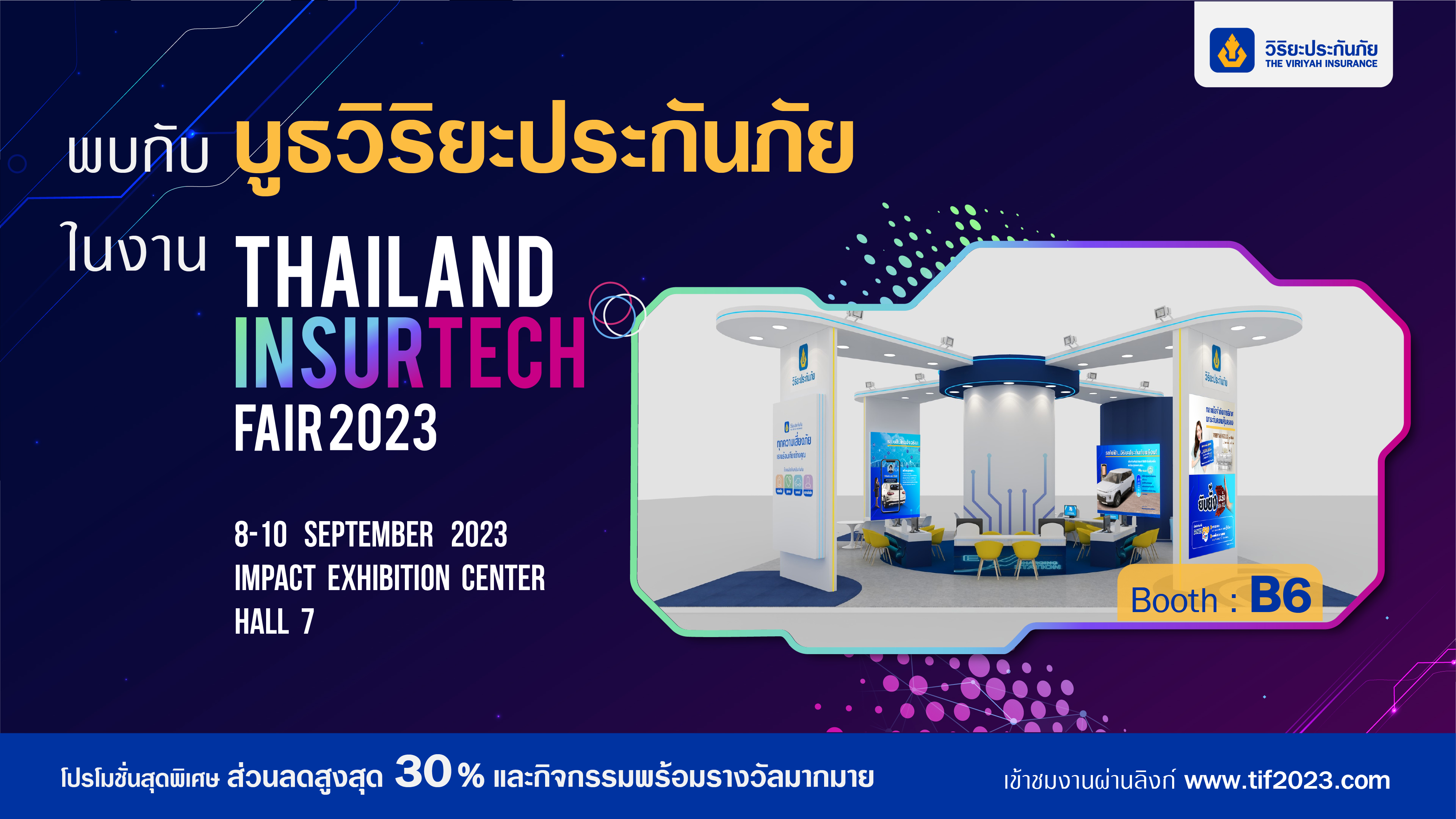 พบกับ บูธวิริยะประกันภัย ได้ในตำแหน่ง B6 ณ อิมแพคเมืองทองธานี ฮอลล์ 7 หรือ เข้าร่วมงานในรูบแบบออนไลน์ ได้ที่ www.TIF2023.com วันที่ 8 – 10 กันยายน 2566 เวลา 9.00 น. - 20.00 น.