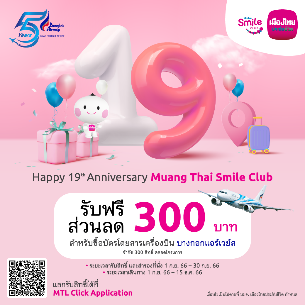 ล่าสุด เมืองไทยประกันชีวิต ฉลองครบรอบ 19 ปีเมืองไทยสไมล์คลับ มอบสิทธิพิเศษแทนคำขอบคุณแด่สมาชิกฯ ที่อยู่เคียงข้างกันในทุกสถานการณ์ตลอด 19 ปีที่ผ่านมา จับมือกับสายการบินบางกอกแอร์เวย์ส มอบสิทธิพิเศษสำหรับสมาชิกฯ รับฟรี ส่วนลด 300 บาท สำหรับซื้อบัตรโดยสารสายการบินบางกอกแอร์เวย์ส ทุกเส้นทางภายในประเทศ และระหว่างประเทศ ที่เริ่มต้นการเดินทางจากประเทศไทย 1 ท่าน / 1 สิทธิ์ / โครงการ จำกัดจำนวน 300 สิทธิ์ โดยระยะเวลารับสิทธิ์ และสำรองที่นั่งระหว่างวันที่ 1 กันยายน 2566 – 30 กันยายน 2566 และระยะเวลาเดินทางตั้งแต่ 1 กันยายน 2566 – 15 ธันวาคม 2566 สายชิลพร้อม!!! เตรียมกดรับสิทธิ์เลยที่ MTL Click Application