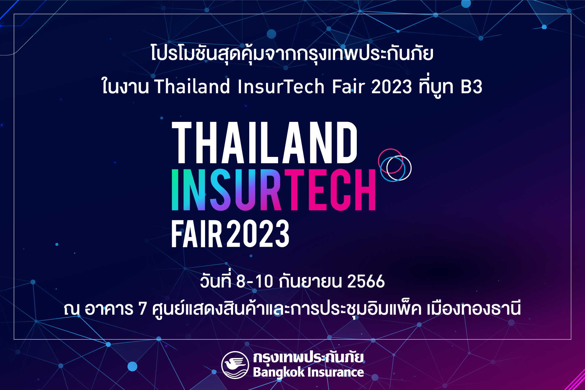 4 กันยายน 2566 : บมจ.กรุงเทพประกันภัย ขอเชิญชวนผู้ที่กำลังมองหาหลักประกันที่อุ่นใจให้กับชีวิตในงานมหกรรมด้านประกันภัยครั้งยิ่งใหญ่ งาน Thailand InsurTech Fair 2023 ภายใต้แนวคิด “STRENGTHENING SUSTAINABILITY THROUGH INSURANCE INNOVATION เสริมสร้างโลกแห่งประกันภัยที่ยั่งยืนด้วยสุดยอดนวัตกรรมด้านประกันภัย” จัดโดยสำนักงานคณะกรรมการกำกับและส่งเสริมการประกอบธุรกิจประกันภัย (คปภ.) วันที่ 8-10 กันยายน 2566 ณ อาคาร 7 ศูนย์แสดงสินค้าและการประชุมอิมแพ็ค เมืองทองธานี