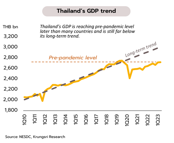ในช่วงครึ่งปีหลัง วิจัยกรุงศรีประเมินว่าเศรษฐกิจไทยยังมีแนวโน้มฟื้นตัว คาดเติบโต 3.4% จาก 2.2% ในช่วงครึ่งแรกของปี โดยมีแรงหนุนหลักจาก (i) ภาคท่องเที่ยวที่คาดว่าจะเติบโตต่อเนื่อง โดยเฉพาะในไตรมาสสุดท้ายของปีซึ่งเป็นช่วงไฮซีซั่น (ii) การดำเนินนโยบายเศรษฐกิจของรัฐบาลชุดใหม่ซึ่งคาดว่าจะช่วยสร้างความเชื่อมั่นปรับดีขึ้น เร่งกระตุ้นการใช้จ่ายในประเทศ โดยล่าสุดรัฐบาลระบุว่าเตรียมการช่วยเหลือ ภาระค่าใช้จ่ายด้านสาธารณูปโภคและพลังงาน ตลอดจนโครงการพักหนี้เกษตรกร