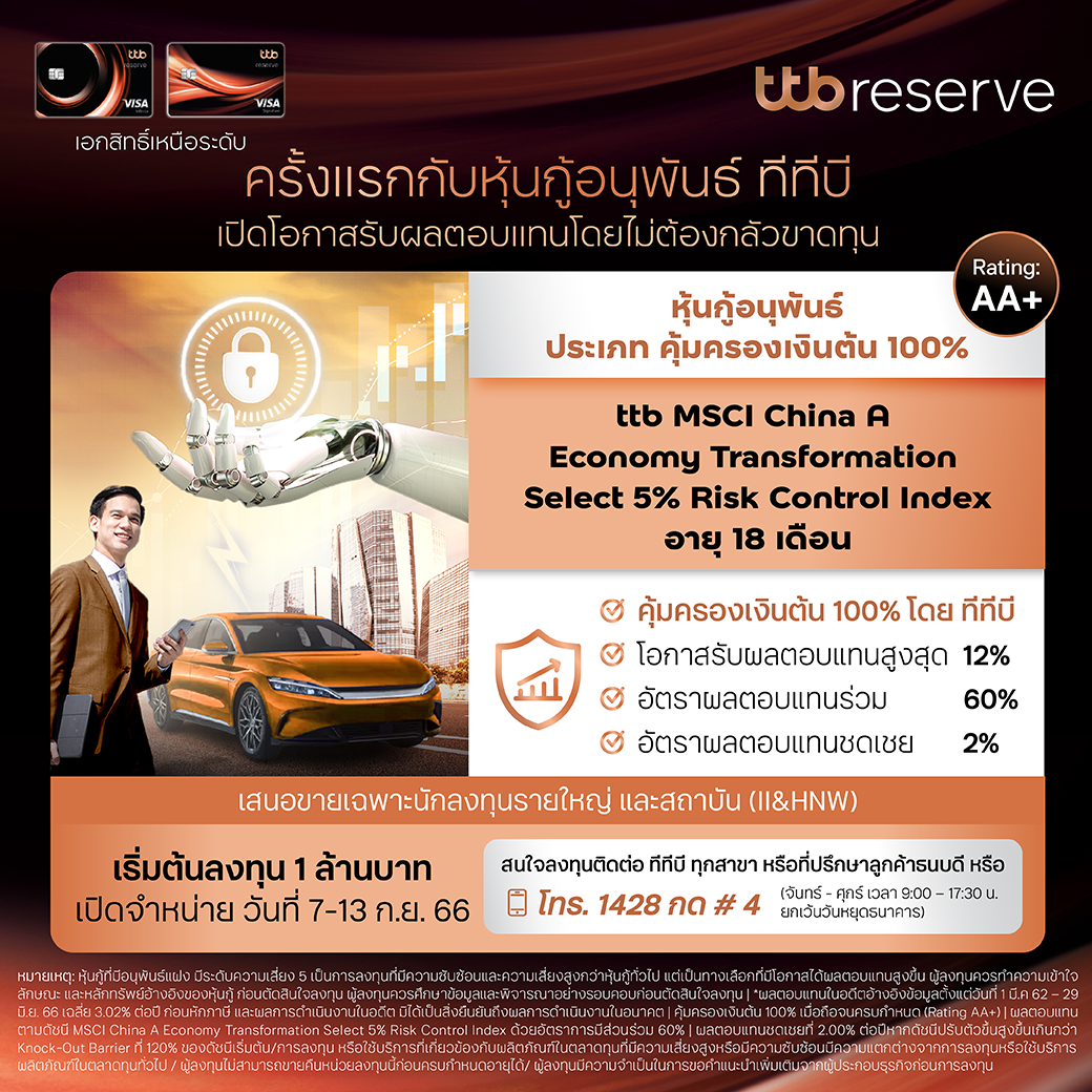 หุ้นกู้อนุพันธ์แฝงอ้างอิงดัชนี “ttb MCSI China A Economy Transformation Select 5% Risk Control Index” เป็นอีกทางเลือกของการลงทุนสำหรับนักลงทุนที่ต้องการ ผลตอบแทนที่เพิ่มขึ้น พร้อมกับคุ้มครองเงินต้นในเวลาเดียวกัน โดยหุ้นกู้ดังกล่าวจะมีการเสนอขายให้กับผู้ลงทุนสถาบันและนักลงทุนรายใหญ่ (II&HNW) ลงทุนขั้นต่ำ 1 ล้านบาท เปิดจองซื้อผ่านสาขาของทีเอ็มบีธนชาต และ ที่ปรึกษาลูกค้าธนบดี ระหว่างวันที่ 7 – 13 กันยายน 2566 นี้