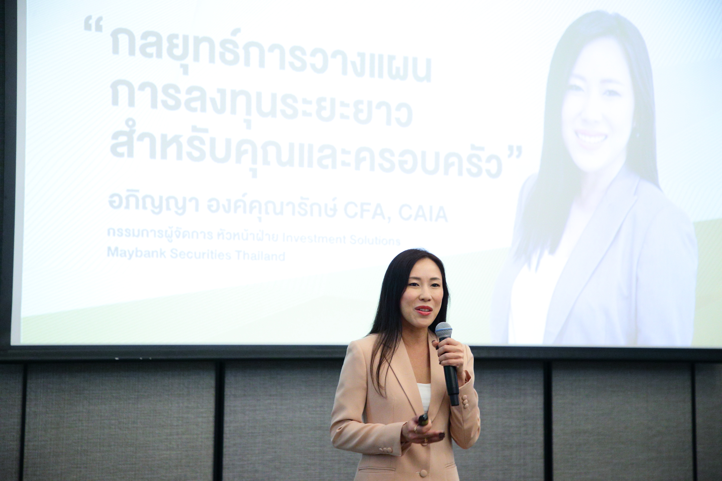 อภิญญา องค์คุณารักษ์ กรรมการผู้จัดการ ฝ่ายงาน Investment Management บมจ. หลักทรัพย์ เมย์แบงก์ (ประเทศไทย) กล่าวว่า นอกจากการใช้ประสบการณ์ของเมย์แบงก์ในการบริหารกองทุนให้กับลูกค้า โดยเข้าไปลงทุนในสินทรัพย์หลากหลาย กระจายความเสี่ยง จัดพอร์ตอย่างเหมาะสมกับสไตล์ลูกค้าแล้ว เมย์แบงก์ ยังให้คำแนะนำถึงกลยุทธ์การวางแผนการลงทุนระยะยาวสำหรับนักลงทุนและครอบครัวเพื่อความมั่งคั่งอย่างยั่งยืน จำเป็นต้องประกอบด้วยหลักคิด 3 ข้อเสมอ นั่นคือ นักลงทุนจำเป็นต้องรู้เป้าหมายที่ชัดเจนว่าต้องการลงทุนเพื่อตัวเองด้วยการวางแผนในวัยเกษียณ หรือ ต้องการส่งต่อเป็น ความมั่งคั่งให้กับคนรุ่นหลังเลือกรูปแบบการลงทุนตามความเสี่ยงที่รับได้ และ ที่สำคัญต้องอยู่ในตลาดทุนเป็นเวลานาน โดยเน้นที่การทยอยลงทุน จึงจะเป็นโอกาสที่ทำให้ไปถึงเป้าหมายได้สำเร็จ