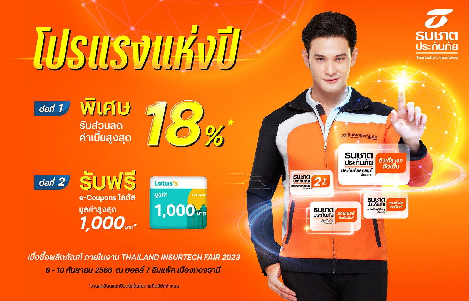 บริษัท ธนชาตประกันภัย จำกัด (มหาชน) นำผลิตภัณฑ์ประกันภัยเข้าร่วมแสดงและให้บริการ ภายในงาน Thailand InsurTech Fair 2023 ซึ่งเป็นงานมหกรรมประกันภัยสุดยิ่งใหญ่แห่งปี จัดขึ้นระหว่างวันที่ 8 - 10 กันยายน 2566 ณ อิมแพคเมืองทองธานี ฮอลล์ 7 เพื่อเป็นการตอกย้ำความเป็นผู้นำในนวัตกรรมประกันภัย โดยได้นำผลิตภัณฑ์เด่นที่ได้รับความนิยมจากลูกค้าเข้าร่วมจำหน่ายภายในงาน พร้อมจัดโปรโมชั่นส่วนลดค่าเบี้ยประกันภัยราคาพิเศษสูงสุดถึง 18%* อาทิ ประกันภัยรถยนต์ ประเภท 2+ฟิต ราคาพิเศษเริ่มต้น 5,275 บาท (ราคาปกติ 6,500 บาท) ประกันภัยรถยนต์ ประเภท 2+จัดเต็ม ราคาพิเศษเริ่มต้นเพียง 6,481 บาท (ราคาปกติ 7,999 บาท)