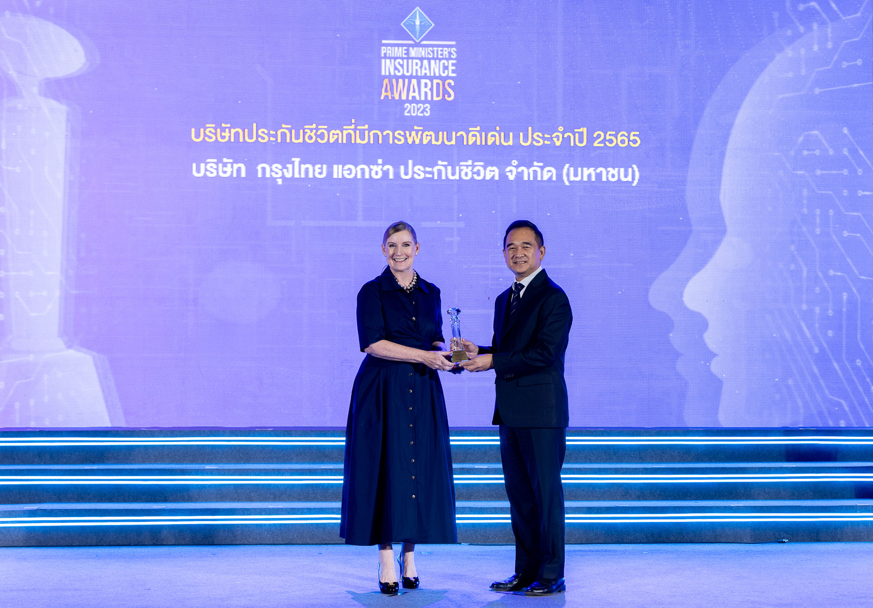 8 กันยายน 2566 : บริษัท กรุงไทย-แอกซ่า ประกันชีวิต จำกัด (มหาชน) โดย คุณแซลลี่ โอฮาร่า ประธานเจ้าหน้าที่บริหาร เข้ารับมอบรางวัล “บริษัทประกันชีวิตที่มีการพัฒนาดีเด่นประจำปี 2565” ในพิธีมอบรางวัลประกันภัยดีเด่นครบวงจร (Prime Minister’s Insurance Awards) ประจำปี 2566 จัดขึ้นโดย สำนักงานคณะกรรมการกำกับและส่งเสริมการประกอบธุรกิจประกันภัย (คปภ.) ซึ่งได้รับเกียรติจาก นายกฤษฎา จีนะวิจารณะ รัฐมนตรีช่วยว่าการกระทรวงการคลัง เป็นผู้มอบ ณ ห้องประชุม ฟีนิกซ์ 1-6 ศูนย์แสดงสินค้าและการประชุมอิมแพ็ค เมืองทองธานี
