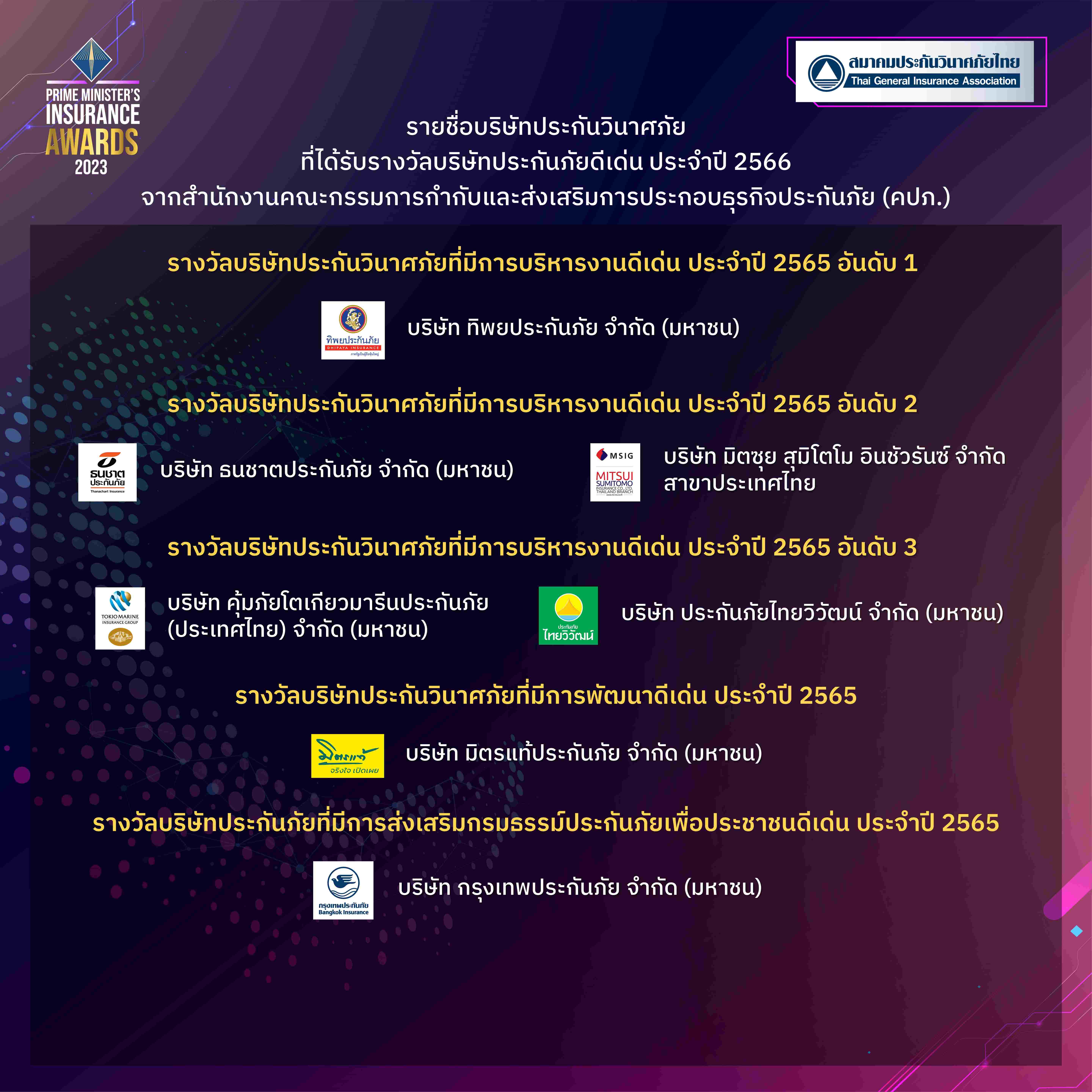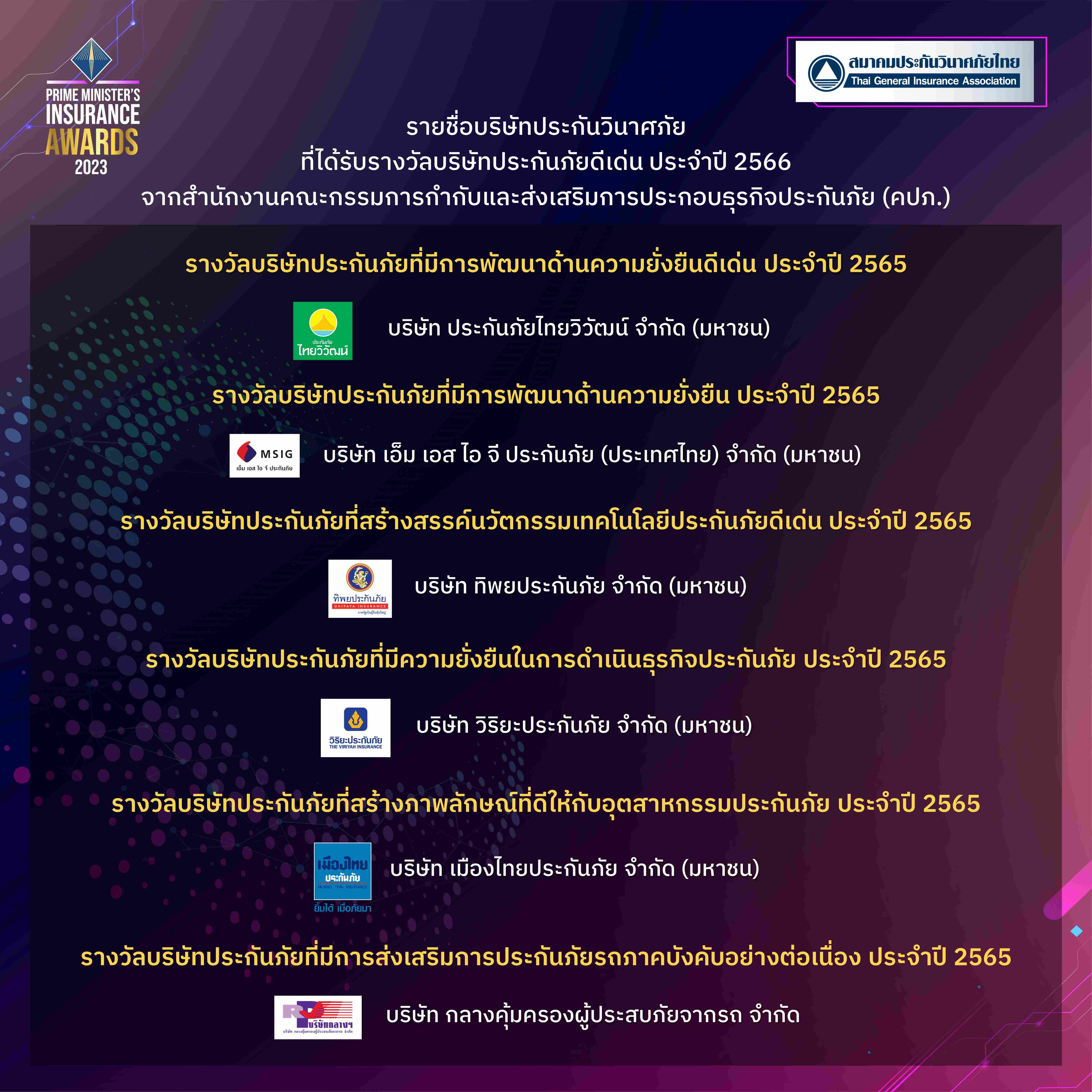 8 กันยายน 2566 : ดร.สมพร สืบถวิลกุล นายกสมาคมประกันวินาศภัยไทย และคณะกรรมการบริหารสมาคมฯ ร่วมแสดงความยินดีกับบริษัทประกันภัย ที่ได้รับรางวัลประกันภัยดีเด่นครบวงจร ประจำปี 2566 (Prime Minister’s Insurance Awards 2023) จากสำนักงานคณะกรรมการกำกับและส่งเสริมการประกอบธุรกิจประกันภัย (คปภ.) โดยมี กฤษฎา จีนะวิจารณะ รัฐมนตรีช่วยว่าการกระทรวงการคลัง เป็นประธานมอบรางวัล ณ ห้องประชุมฟีนิกซ์ ศูนย์แสดงสินค้าและการประชุมอิมแพ็ค เมืองทองธานี ซึ่งมีรายชื่อบริษัทประกันภัยที่ได้รับรางวัลดังนี้