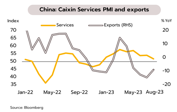 จีน : การชะลอตัวของภาคบริการและการหดตัวของภาคส่งออกกดดันเศรษฐกิจจีน แม้มาตรการต่างๆช่วยเสริมสภาพคล่องและพยุงภาคอสังหาริมทรัพย์ ในเดือนสิงหาคม ดัชนี PMI ในภาคบริการที่สำรวจโดยภาคเอกชนหรือ Caixin เติบโตในอัตราต่ำสุดในรอบ 8 เดือน ที่ 51.8 (ต่ำกว่าตลาดคาดที่ 53.6) แม้ดัชนี PMI ภาคการผลิตปรับดีขึ้นสู่ 51.0 (จาก 49.2 ในเดือนก่อน) แต่ดัชนี Composite PMI ที่สะท้อนภาพรวมทั้งภาคการผลิตและภาคบริการ กลับอ่อนแอสุดนับต่ำแต่เดือนมกราคมซึ่งเป็นช่วงที่เริ่มเปิดประเทศ โดยลดลงสู่ 51.7 ส่วนภาคการส่งออกหดตัวต่อเนื่องเป็นเดือนที่ 4 ที่ -8.8% YoY ด้านการนำเข้าหดตัวต่อเนื่องเป็นเดือนที่ 6 ที่ -7.3% ด้านอัตราเงินเฟ้อยังอยู่ในระดับต่ำที่ 0.1% YoY จาก -0.3% ในเดือนก่อนหน้า