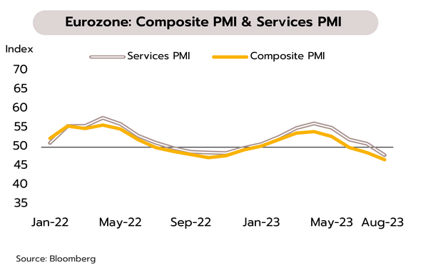 อัตราดอกเบี้ยนโยบายที่เพิ่มขึ้นและเงินเฟ้อที่อยู่ในระดับสูงส่งผลกระทบมากขึ้นต่อภาพรวมเศรษฐกิจยูโรโซนสะท้อนจาก (i) ยอดค้าปลีกหดตัวต่อเนื่องเป็นเดือนที่ 10 (ii) ดัชนี Composite PMI หดตัวมากที่สุดนับตั้งแต่เดือนพฤศจิกายน 2563 (iii) ดัชนีความเชื่อมั่นเศรษฐกิจติดลบต่อเนื่องเป็นเดือนที่ 4 และ (iv) ดัชนีความเชื่อมั่นผู้บริโภคที่ปรับลดลงเป็นครั้งแรกนับตั้งแต่เดือนกันยายน 2565 ซึ่งสอดคล้องกับตัวเลขประมาณการ GDP ไตรมาส 2/66 ของยูโรโซนที่เติบโตเพียง 0.1% QoQ