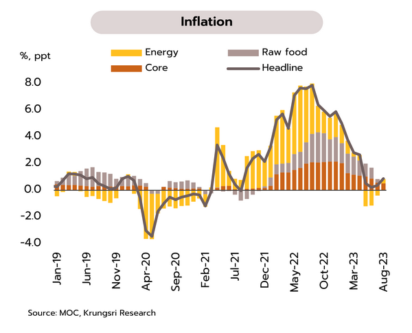 แนวโน้มอัตราเงินเฟ้อทั่วไปในช่วงที่เหลือของปีคาดว่าอาจขยับขึ้นบ้างจากระดับปัจจุบัน เนื่องจาก (i) ราคาน้ำมันดิบในตลาดโลกที่ผันผวนสูงซึ่งได้รับแรงกดดันจากกลุ่มโอเปคขยายเวลาลดกำลังการผลิต 1 ล้านบาร์เรล/ วันจนถึงสิ้นปีนี้ และรัสเซียขยายเวลาการปรับลดการส่งออกน้ำมันสู่ตลาดโลกลง 300,000 บาร์เรล/วันจนถึงสิ้นปีนี้เช่นกัน และ (ii) ผลกระทบของเอลนีโญที่อาจส่งผลต่อราคาสินค้าเกษตร