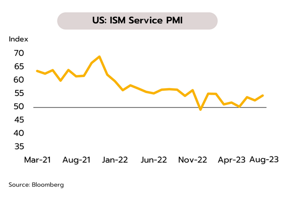 ตัวเลขในภาคบริการและตลาดแรงงานหนุนภาพการฟื้นตัวแบบ goldilocks (เศรษฐกิจที่ไม่ร้อนแรงเกินไปจนสร้างแรงกดดันเงินเฟ้อ และไม่ชะลอแรงเกินไปจนเสี่ยงต่อการเข้าสู่ภาวะถดถอย) สอดคล้องกับตัวเลขประมาณการ GDP ไตรมาส 3/66 ที่คาดว่าจะขยายตัวสูงถึง 5.6% หลังขยายตัว 2.0% และ 2.1% ในไตรมาส 1 และ 2 ตามลำดับ ส่งผลให้ตลาดปรับเพิ่มคาดการณ์เฟดขึ้นอัตราดอกเบี้ยในการประชุมเดือนพฤศจิกายนเป็น 43.6% จากสัปดาห์ก่อนหน้าที่ 33.5%