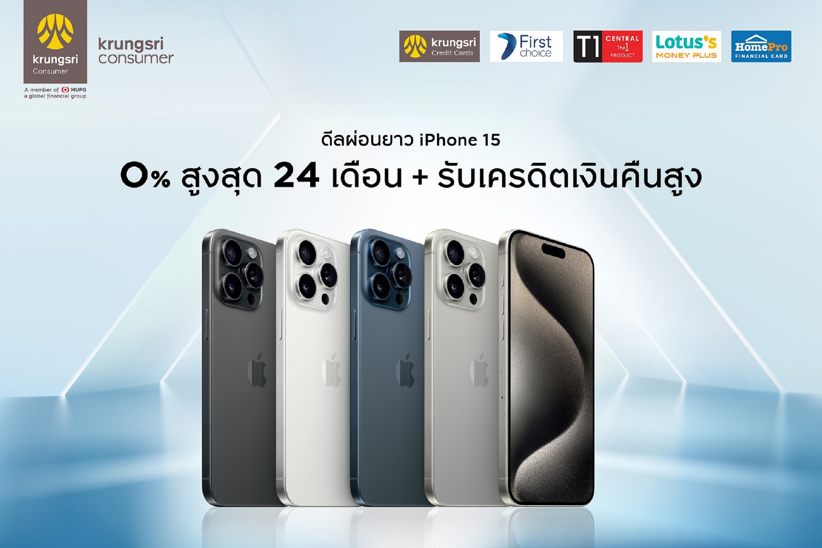 กรุงเทพฯ, 18 กันยายน 2566 : กรุงศรี คอนซูมเมอร์ ฉลองเปิดตัว iPhone 15 ทุกรุ่น เอาใจสมาชิกบัตรเครดิต กรุงศรี, บัตรกรุงศรีเฟิร์สช้อยส์, บัตรเครดิต เซ็นทรัล เดอะวัน, บัตรเครดิต โลตัส วีซ่า และบัตรเครดิต โฮมโปร วีซ่า ตั้งแต่ 15 กันยายน 2566 – 29 กุมภาพันธ์ 2567 กับดีลฮอต ‘ผ่อนยาวสะใจ 0% นานสูงสุด 24 เดือน’ ให้สมาชิกบัตรเป็นเจ้าของ iPhone 15 ได้ง่าย ๆ พร้อมรับเครดิตเงินคืนสูงสุด 18,000 บาท และยังใช้คะแนนแลกเครดิตเงินคืนเพิ่ม 12% เมื่อใช้จ่ายที่ AIS, True และ Advice นอกจากนั้น เฉพาะร้าน Studio7, Banana, iStudio และ .life รับสิทธิ์ผ่อน 0% นานสูงสุด 20 เดือน และใช้บริการ 0% Pay Later ซื้อวันนี้ เริ่มผ่อน 2 เดือนข้างหน้า