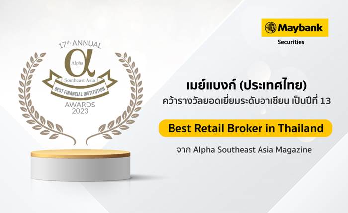 19 กันยายน 2566 : บมจ.หลักทรัพย์ เมย์แบงก์ (ประเทศไทย) คว้ารางวัลยอดเยี่ยมระดับอาเซียน Best Retail Broker in Thailand เป็นปีที่ 13 จากเวที Alpha Southeast Asia Awards 2023 ซึ่งจัดขึ้นเป็นปีที่ 17 โดยนิตยสาร Alpha Southeast Asia นิตยสารชั้นนำด้านการลงทุน สถาบันทางการเงิน การธนาคาร และตลาดทุนของภูมิภาคเอเชียตะวันออกเฉียงใต้ ถือเป็นรางวัลแห่งความภาคภูมิใจ พร้อมกับตอกย้ำความเป็นผู้เชี่ยวชาญด้านการลงทุนครอบคลุมทั้งลูกค้ารายย่อยและสถาบัน โดย เมย์แบงก์ (ประเทศไทย) พร้อมเดินหน้าวิชั่น Democratizing Investment เพื่อให้คนไทยทุกคนสามารถเข้าถึงการลงทุนได้อย่างทั่วถึง
