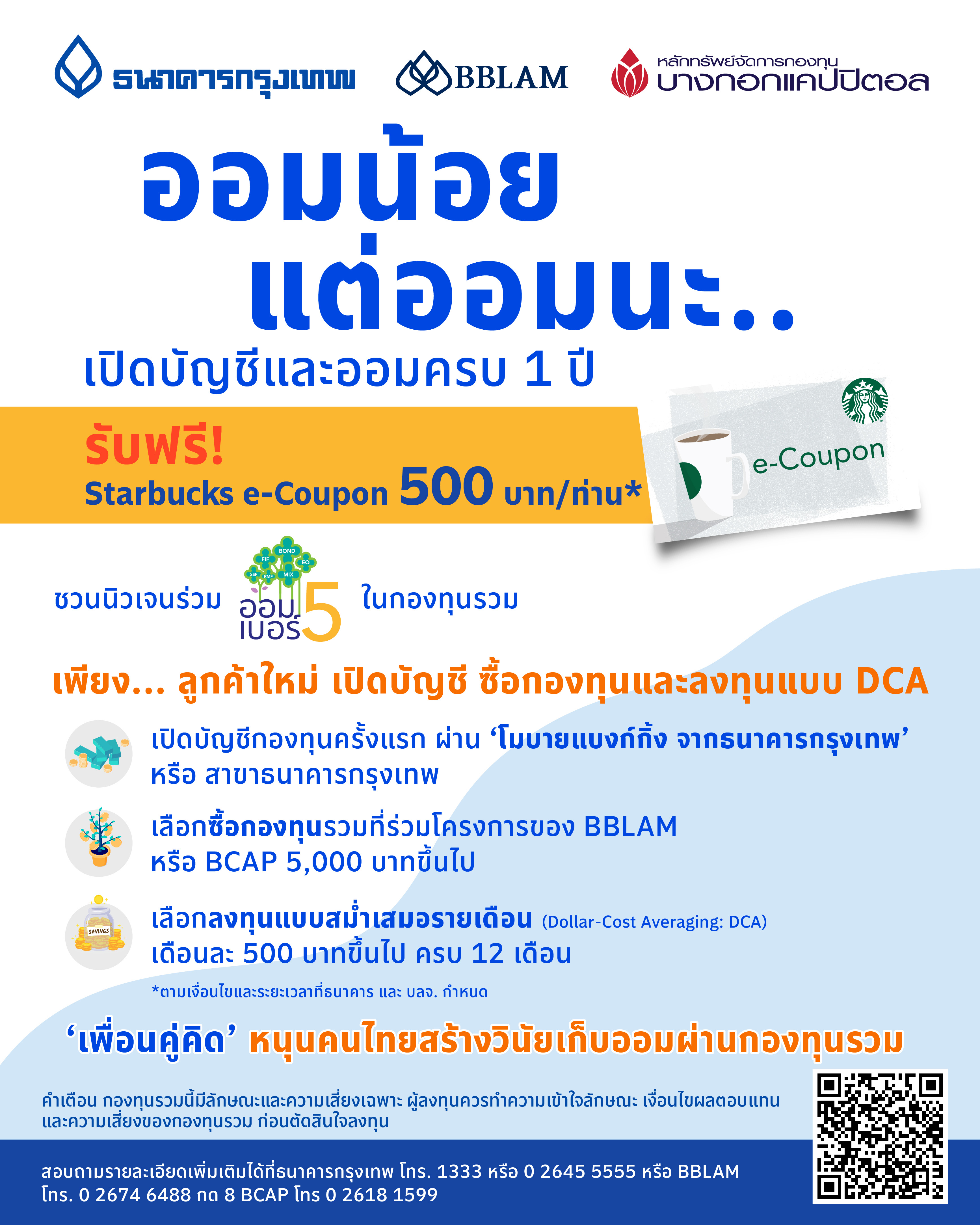 สำหรับผู้สนใจ เพียงเปิดบัญชีกองทุนครั้งแรก ผ่าน ‘โมบายแบงก์กิ้ง จากธนาคารกรุงเทพ’ หรือที่ธนาคารกรุงเทพทุกสาขา และลงทุนกองทุนตามที่กำหนดตั้งแต่ 5,000 บาทขึ้นไป ระหว่างวันที่ 5 ก.ย. 66 – 30 พ.ย. 66 และลงทุนแบบ DCA เดือนละ 500 บาทขึ้นไป (ครั้งแรกสำเร็จ ระหว่างวันที่ 5 ก.ย. 66 – 29 ธ.ค. 66) และลงทุนแบบ DCA ต่อเนื่องไปจนครบ 12 เดือน ภายในวันที่ 30 ธ.ค. 67 รับฟรี! Starbucks e-Coupon มูลค่า 500 บาท/ท่าน ทั้งนี้ สิทธิพิเศษเฉพาะลูกค้าใหม่ที่ไม่เคยมีบัญชีกองทุนรวมกับ BBL โดยเงื่อนไขเป็นไปตามที่ธนาคาร และ บลจ. กำหนด