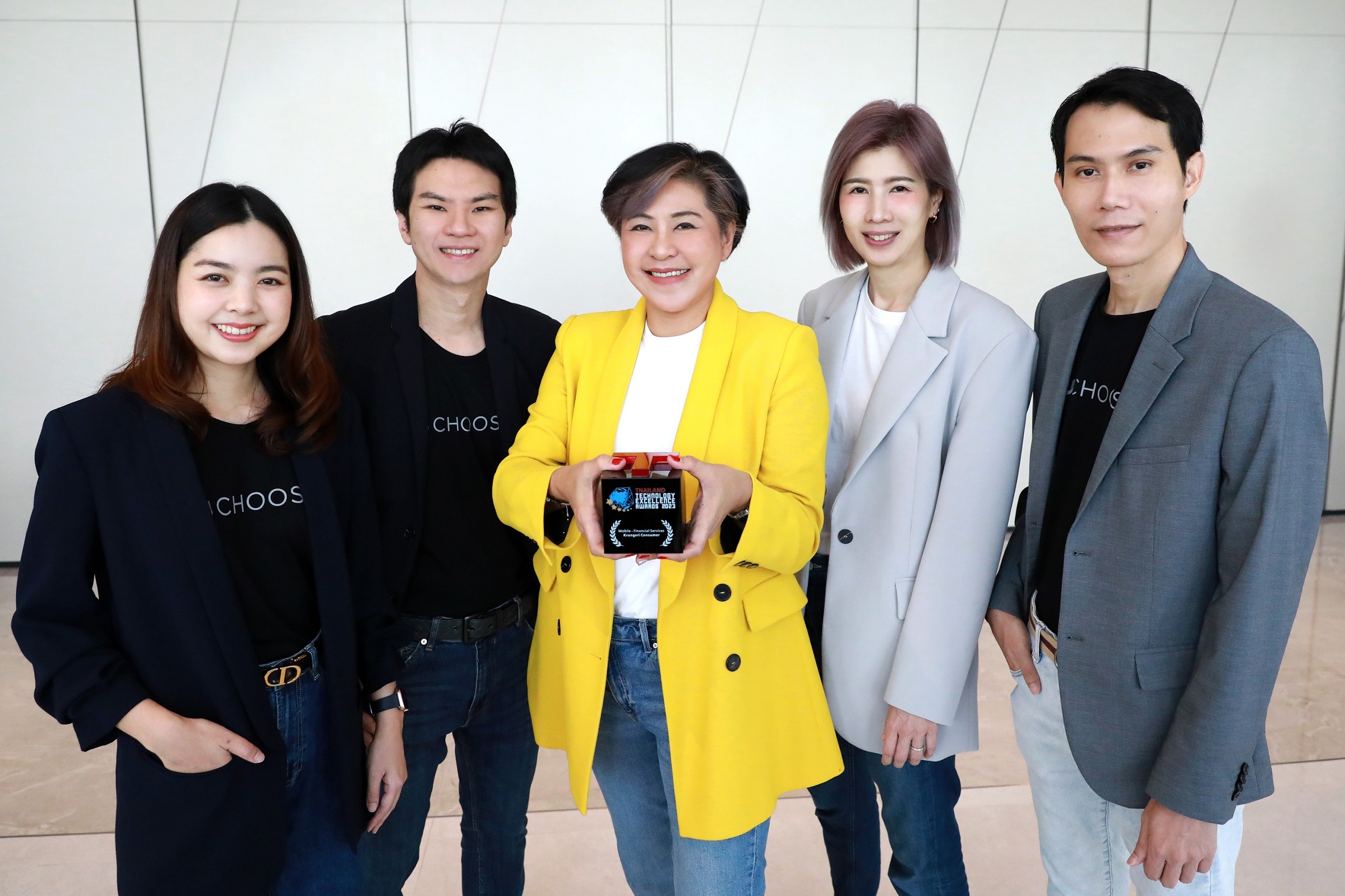 กรุงเทพฯ, 2 ตุลาคม 2566 : อัญชุลี แววทอง (กลาง) ผู้อำนวยการอาวุโส สายงานบริหารการปฏิบัติการและฝ่ายนวัตกรรมทางการเงิน กรุงศรี คอนซูมเมอร์ และทีม UCHOOSE รับรางวัล Thailand Technology Excellence Award for Mobile – Financial Services รางวัลดีเด่นด้านเทคโนโลยีประเภทโมบายแอปพลิเคชัน สำหรับธุรกิจบริการทางการเงิน ต่อเนื่องเป็นปีที่ 3 จากงาน Asian Technology Excellence Awards 2023