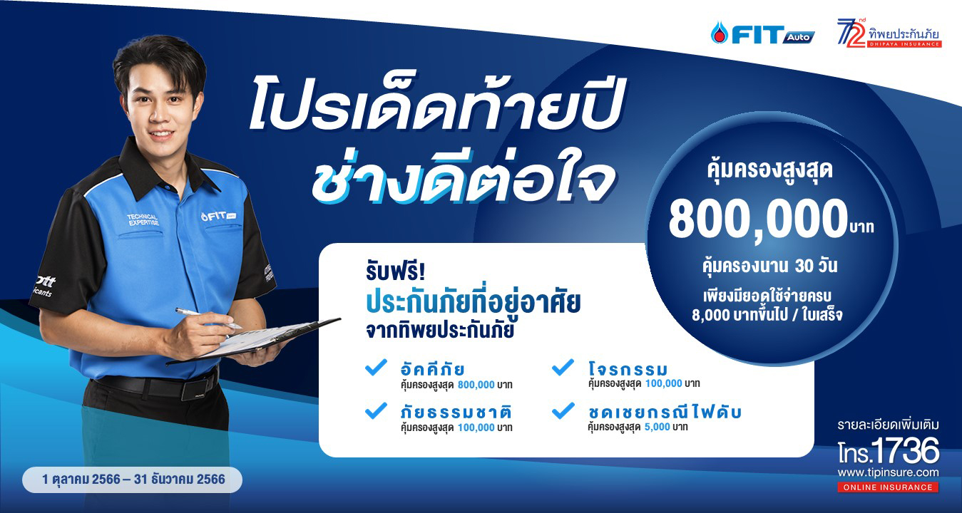 ทิพยประกันภัย ส่งโปรโมชัน “ดีต่อใจดีต่อบ้าน” เข้าร่วมแคมเปญดังกล่าว เพื่อมอบความอุ่นใจไร้กังวลด้วยประกันภัยที่อยู่อาศัย คุ้มครองครบทุกความต้องการไฟไหม้ ฟ้าผ่า น้ำท่วม ระเบิด ภัยเนื่องจากน้ำ ลูกเห็บ ลมพายุ แผ่นดินไหว การประท้วง รวมถึงความคุ้มครองอื่น ๆ เช่น การโจรกรรม ความรับผิดต่อบุคคลภายนอก เงินชดเชยค่าที่พักอาศัยชั่วคราว และกรณีไฟฟ้าดับ ให้บ้านและคอนโดของคุณปลอดภัยในทุกเวลา ความคุ้มครองสูงสุดถึง 800,000 บาท นาน 30 วัน ฟรี เมื่อมียอดชำระครบ 8,000 บาทขึ้นไปที่ FIT Auto