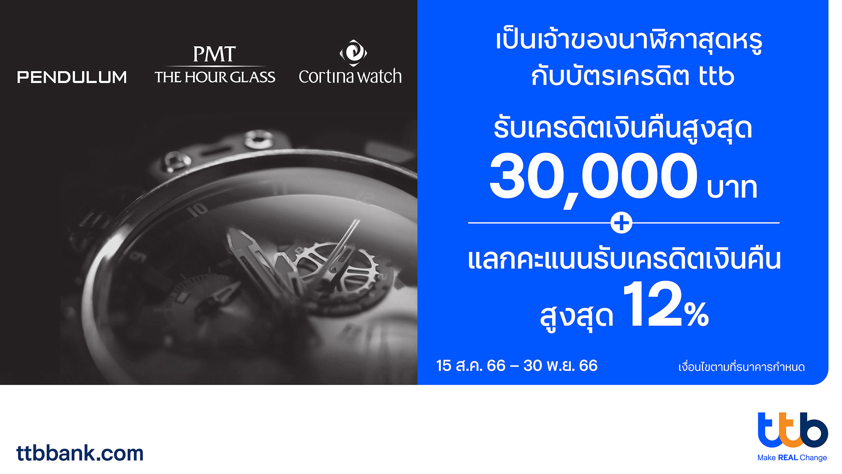 6 ตุลาคม 2566 : ทีเอ็มบีธนชาต หรือ ทีทีบี มอบสิทธิพิเศษ สำหรับผู้ถือบัตรเครดิต ttb เมื่อซื้อนาฬิกาแบรนด์ดังสุดหรู PENDULUM, PMT THE HOUR GLASS และ Cortina Watch ณ ร้านค้าที่ร่วมรายการ ได้แก่ PENDULUM เซ็นทรัลเวิลด์ / สยามพารากอน / เชียงใหม่ Franck Muller สยามพารากอน PMT THE HOUR GLASS สยามพารากอน / ไอคอนสยาม / เซ็นทรัล เอ็มบาสซี / เกษรวิลเลจ / เอ็มควอเทียร์ / ภูเก็ตฟลอเรสต้า Cortina Watch – Cartier เซ็นทรัล เอ็มบาสซี Cortina Watch เซ็นทรัล ลาดพร้าว และ Cortina Watch – Frank Muller แมนดาริน โอเรียนเต็ล กรุงเทพ ระหว่างวันที่ 15 สิงหาคม 2566 – 30 พฤศจิกายน 2566 โดยมอบสิทธิพิเศษดังนี้