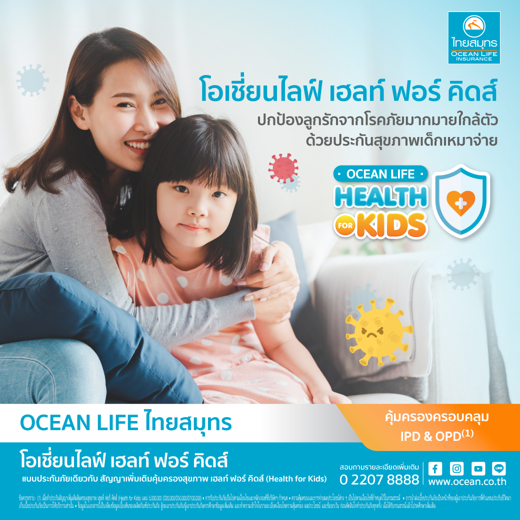 OCEAN LIFE ไทยสมุทร จึงพัฒนาสัญญาเพิ่มเติมคุ้มครองสุขภาพ “โอเชี่ยนไลฟ์ เฮลท์ ฟอร์ คิดส์” (OCEAN LIFE Health For Kids) ประกันสุขภาพเหมาจ่ายสำหรับเด็ก ตอบโจทย์พ่อแม่ที่ห่วงใยลูกรักในยุคโรคระบาดที่อาจติดต่อกันได้ตลอดเวลา หากมีประกันสุขภาพนี้ก็จะช่วยแบ่งเบาค่ารักษาพยาบาล สร้างความมั่นใจให้ลูกรักมีทางเลือกในการรักษาที่มากขึ้น โดยมีความคุ้มครองค่ารักษาพยาบาลผู้ป่วยใน (IPD) แบบเหมาจ่าย ทั้งการเจ็บป่วยและอุบัติเหตุสูงสุด 5,000,000 บาทต่อปี พร้อมความคุ้มครองค่ารักษาพยาบาลแบบผู้ป่วยนอก (OPD) สูงสุด 5,000 บาทต่อปี (เมื่อทำประกันสัญญาเพิ่มเติมคุ้มครองสุขภาพ เฮลท์ ฟอร์ คิดส์ (Health for Kids) แผน 5,000,000 (D20,000/D50,000 /D100,000)