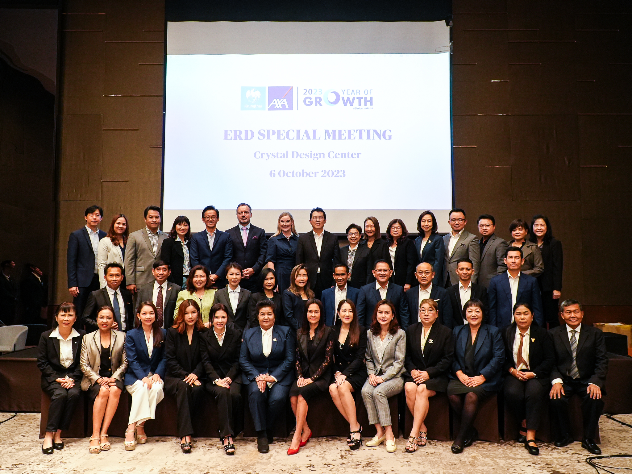 11 ตุลาคม 2566 : บมจ.กรุงไทย-แอกซ่า ประกันชีวิต นำโดยคุณแซลลี่ โอฮาร่า ประธานเจ้าหน้าที่บริหาร (แถวหลัง คนที่ 7 จากซ้าย) มร.เดวิด แกรนท์ ประธานเจ้าหน้าที่บริหาร ฝ่ายจัดจำหน่าย ภูมิภาคตะวันออกเฉียงใต้ (แถวหลัง คนที่ 6 จากซ้าย) คุณชัยณรงค์ เอื้อสิทธิชัย ประธานเจ้าหน้าที่บริหาร ฝ่ายจัดจำหน่าย (แถวหลัง คนที่ 5 จากซ้าย) ดร.อุกฤษฎ์ ศรีดโรมนต์ ประธานเจ้าหน้าที่บริหาร แผนกตัวแทนและแผนกฝึกอบรมและพัฒนาฝ่ายจัดหน่าย (แถวหลัง คนที่ 8 จากซ้าย) และผู้บริหารระดับสูงของ กรุงไทย-แอกซ่า ประกันชีวิต จัดงานสัมมนา ERD Special Meeting ให้แก่คณะผู้บริหารฝ่ายขายระดับ ผู้อำนวยการบริหาร-ฝ่ายตัวแทน (ERD)
