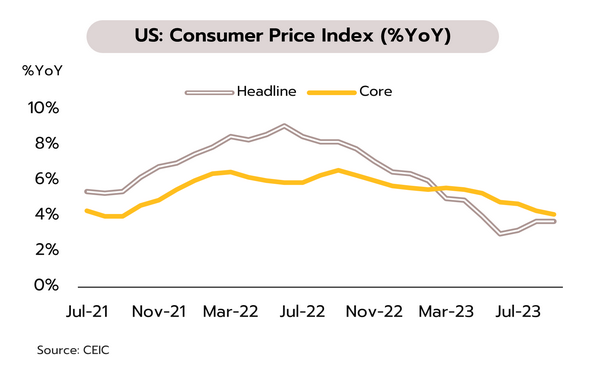 เบื้องต้นคาดสงครามอิสราเอล-ฮามาส ไม่กระทบต่อมุมมองดอกเบี้ยนโยบายของเฟดในไตรมาส 4 ในเดือนกันยายน ดัชนีผู้ผลิต (PPI) เพิ่มขึ้น 2.2% YoY จากเดือนก่อนหน้าที่ 2.0% ส่วนดัชนีราคาผู้ผลิตพื้นฐานเพิ่มขึ้น 2.7% YoY จากเดือนก่อนหน้าที่ 2.5%
